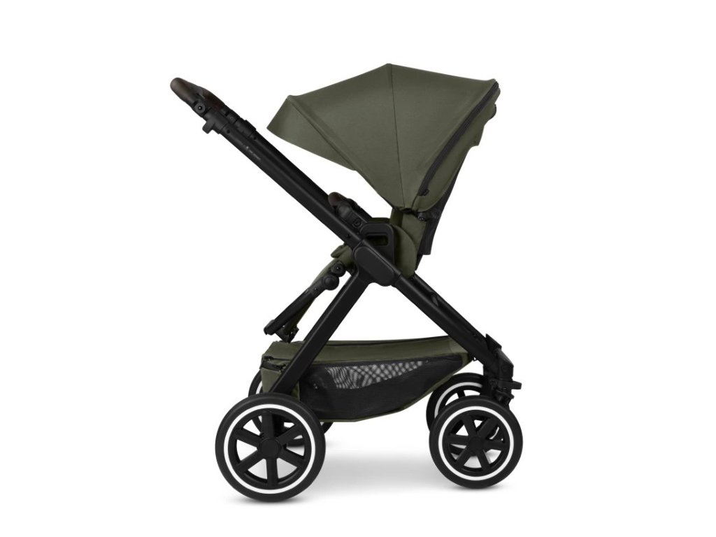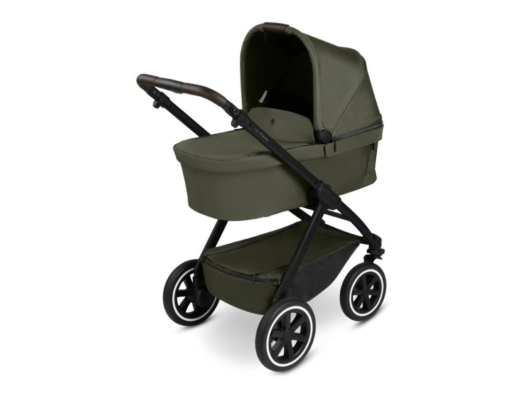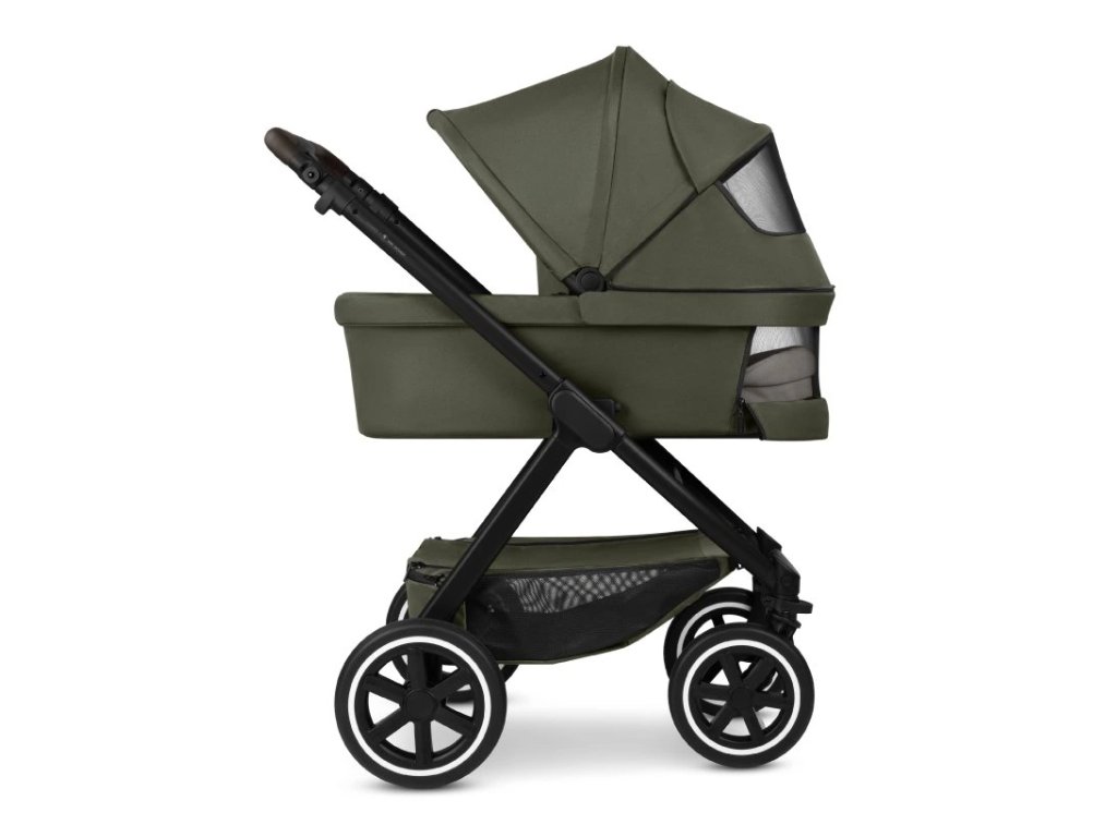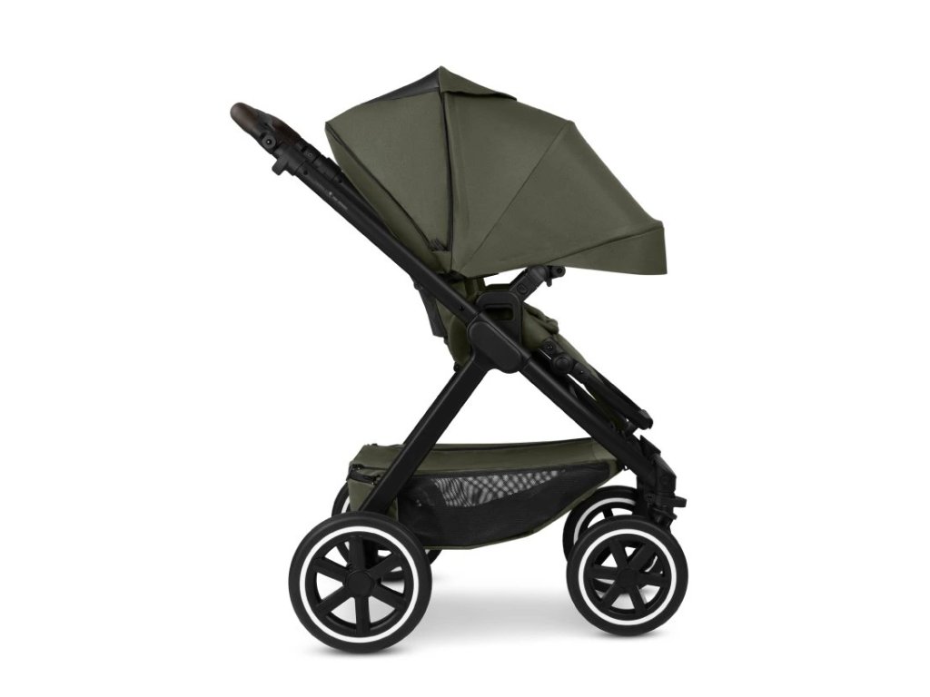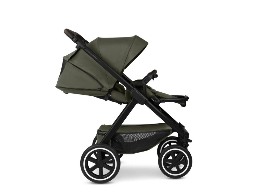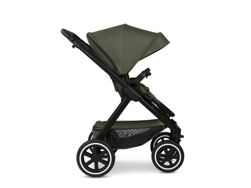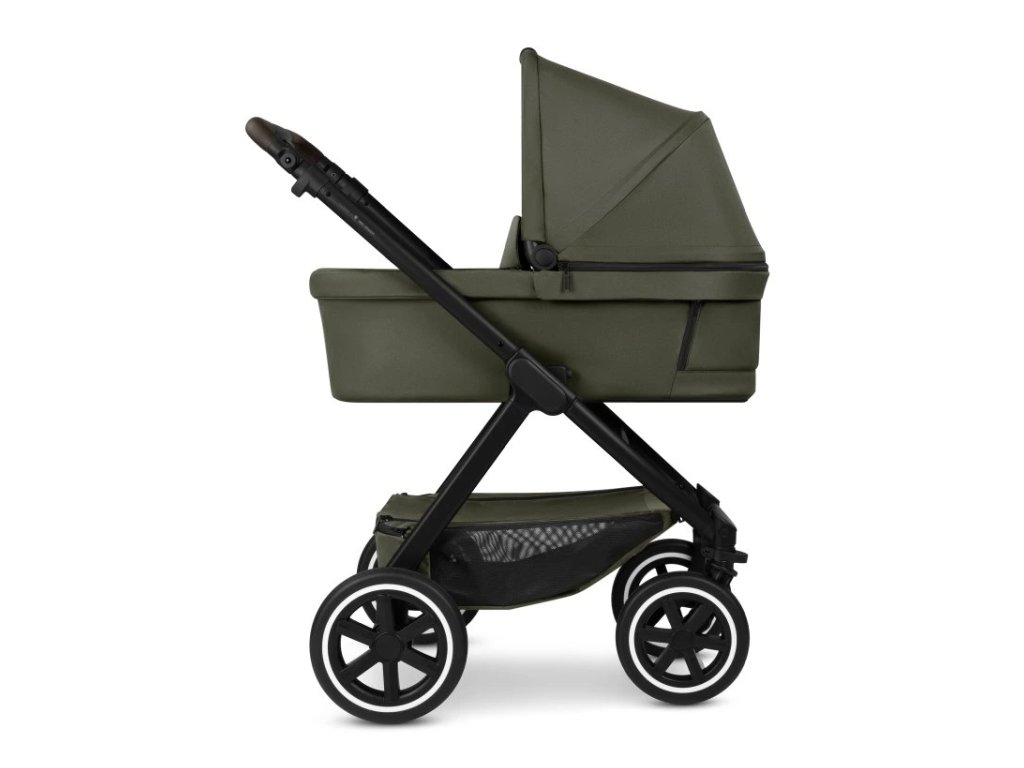 Chytré: Parkovací brzda je umístěna přímo na pravém zadním kole. Tím odpadá potřeba zadní nápravy. To šetří hmotnost a prostor a zároveň zvyšuje komfort tlačení. S volitelnou korbičkou / k dokoupení / pro kočárek Samba 2 vás vaše děťátko může doprovázet od narození.