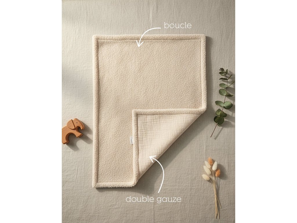 Materiál: Látka 1: Buklé (ovčí) – 100% polyester, Látka 2: Dvojitý mušelín – 100% bavlna.