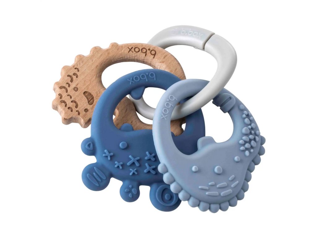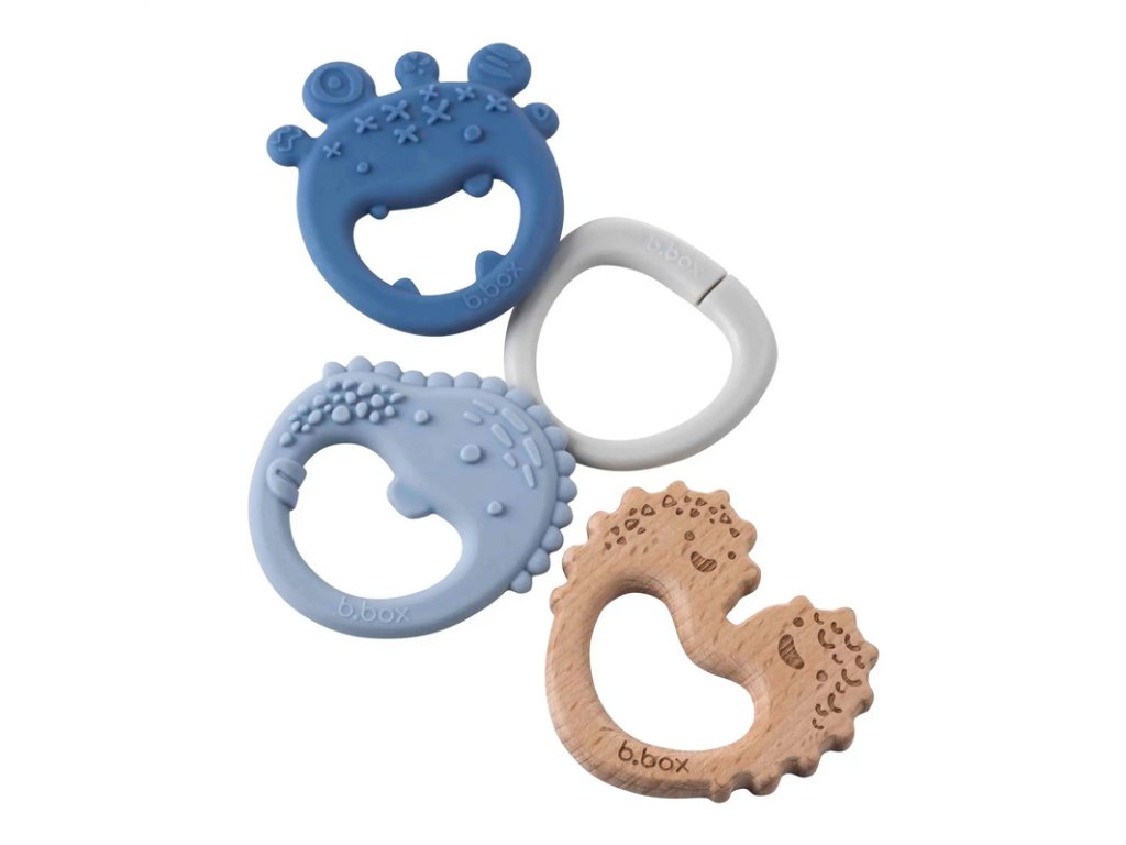 Představujeme vám b.box Trio kousátko, které uleví bolavým dásním a zároveň stimuluje senzorické schopnosti. Tři texturovaná kousátka na šikovném kroužku nabízí dítěti výběr mezi dvěmi silikonovými kousátky a dřevěným kousátkem. Kousátka jsou lehká a velmi dobře padnou do dětských ruček. Lze je používat samostatně nebo v setu na kroužku.
