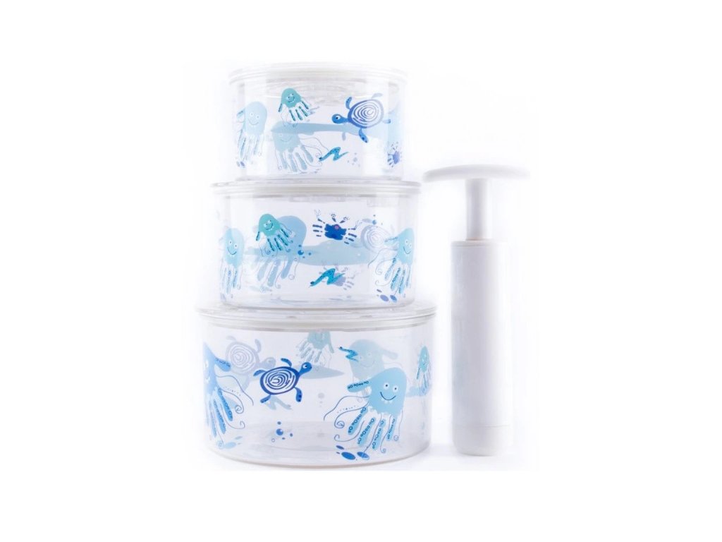 Baby Monsters sada 3 vakuových krabiček Tup Air, set obsahuje 3 x krabičku, pumpu, 3 x těsnící kryt s ventilkem a ukazatelem tlaku. Sada vakuových krabiček Baby Monsters Tup Air udrží vaše jídlo déle čerstvé, je ideální na cesty.