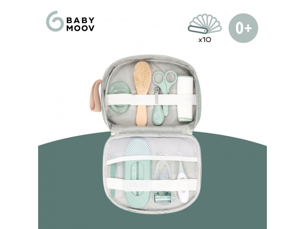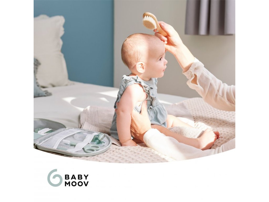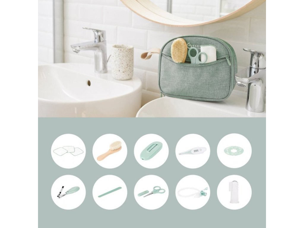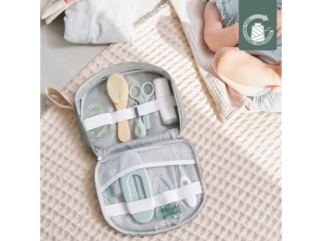 Sada obsahuje digitální teploměr pro sledování teploty miminka, nepostradatelnou dětskou odsávačku, koupelový teploměr pro zajištění správné teploty vody a dále vše, co je potřeba pro péči o drobné nehtíky (mini nůžky se zaoblenými špičkami a pilník) a také masážní kartáček na dásně, který se vejde na konec prstu, a kroužek na kousání, který lze vložit do lednice, aby se dítěti ulevilo od bolesti doprovázející růst prvních zoubků. Nově je také v této sadě roztomilý, super měkký kartáč vyrobený ze dřeva s certifikací FSC pro jemné vlásky děťátka.
