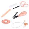 Tato sada obsahuje 9 produktů: nosní odsávačku, hřebínek, nůžky s kulatou špičkou a krytem, pilníček, kleštičky na nehty, silikonový kartáček, digitální teploměr s ohebnou špicí a pouzdrem, teploměr do vody a kousátko.