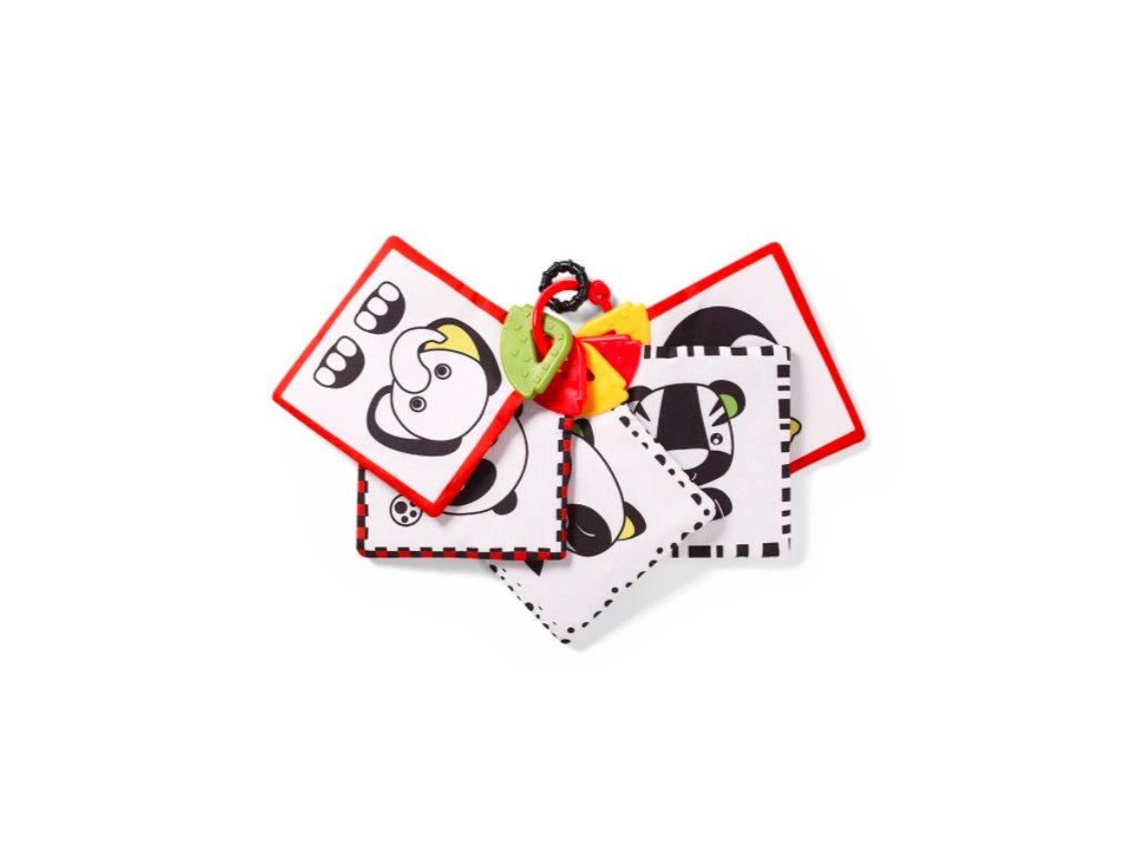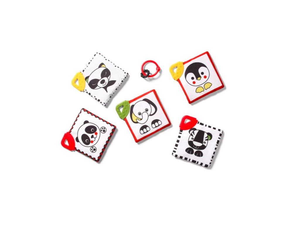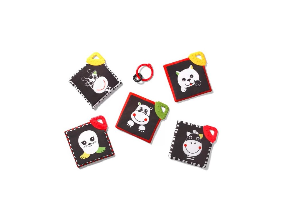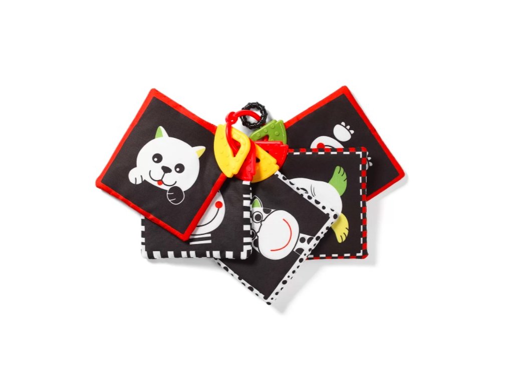 Tato krásná látková kontrastní knížka je nenahraditelná do postýlky nebo do kočárku. Dětem se bude bezchybně držet v jejich malinkých ručičkách. Uvnitř každého listu se skrývá šustící vložka a pískátko, které se stane předmětem zkoumání. Po straně děti najdou kousátko, které je bude lákat a dá se vložit do pusy. Navíc červená černá a bílá je první barva, kterou miminka vidí, takže hračka bude tou pravou volbou. Listy knihy jsou spojeny kroužkem z kterého se dají odnímat.