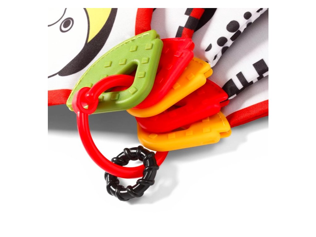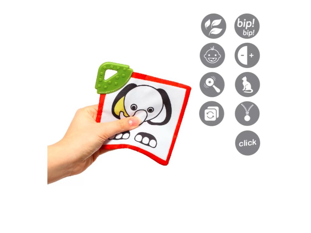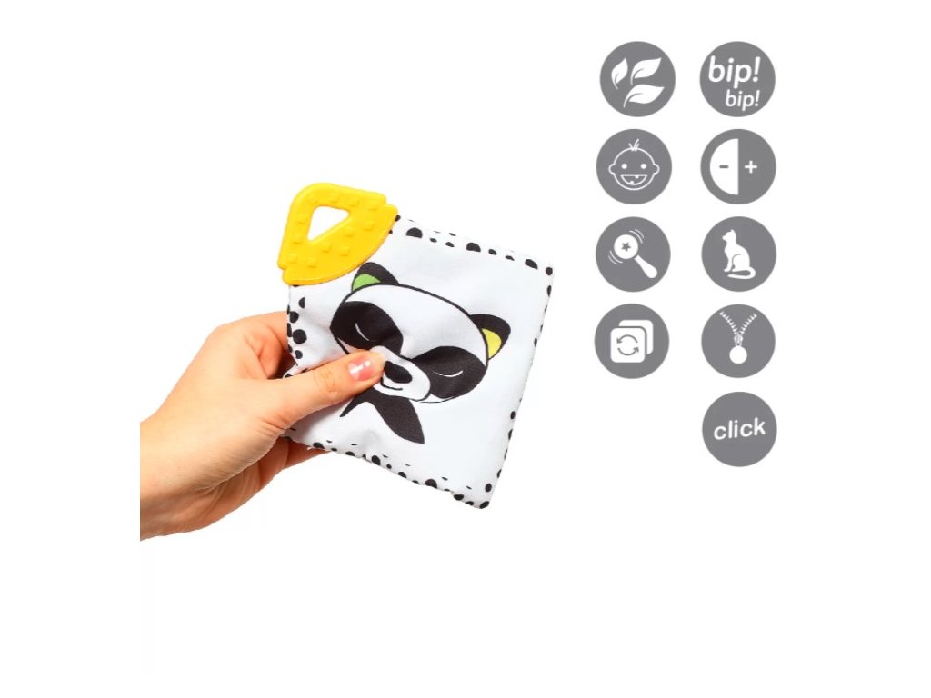 Tato krásná látková kontrastní knížka je nenahraditelná do postýlky nebo do kočárku. Dětem se bude bezchybně držet v jejich malinkých ručičkách. Uvnitř každého listu se skrývá šustící vložka a pískátko, které se stane předmětem zkoumání. Po straně děti najdou kousátko, které je bude lákat a dá se vložit do pusy. Navíc červená černá a bílá je první barva, kterou miminka vidí, takže hračka bude tou pravou volbou.