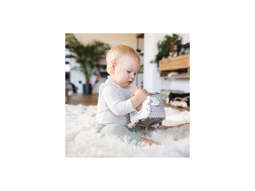 Šustící zvuky rozvíjejí sluch a různé textury a vyčnívající prvky stimulují hmat. Zrcátko a zatahovací míček s jemným chrastítkem také zaujmou vaše dítě.