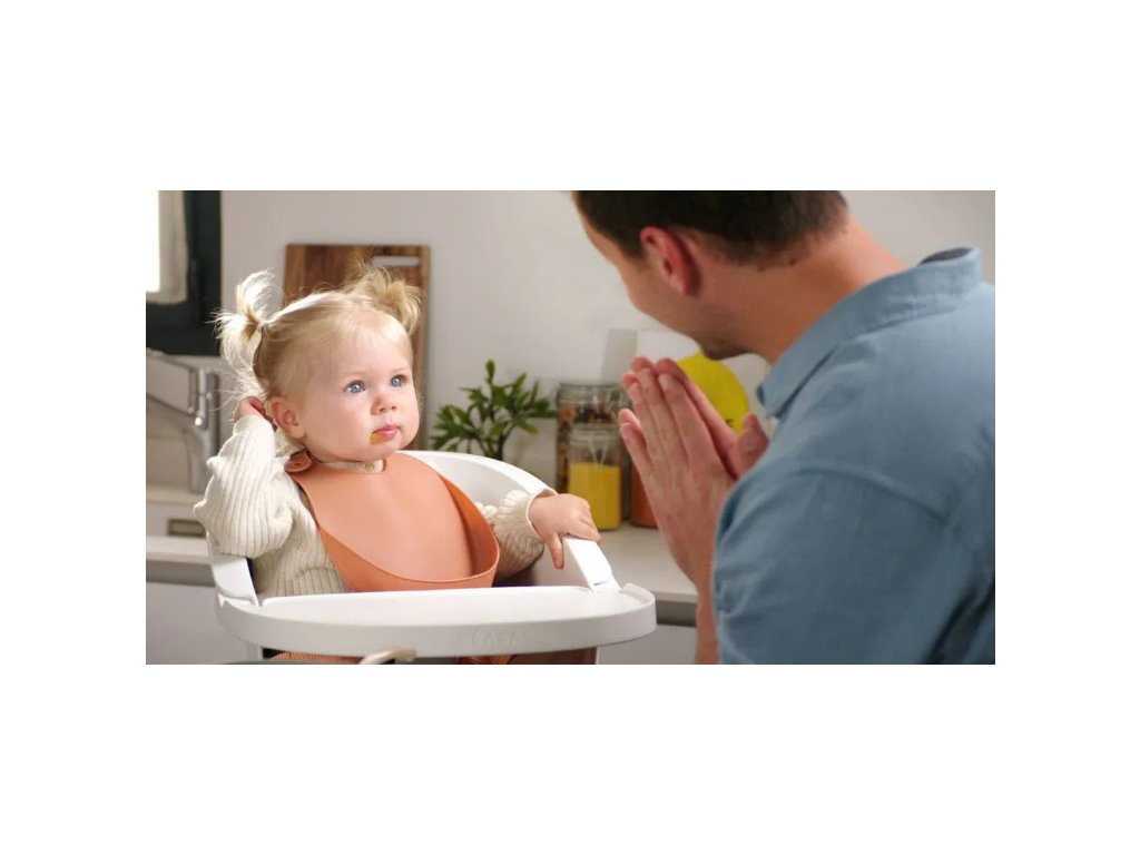 Popis: Bryndák pro děti Silicone Bib Beaba Terracotta z měkkého silikonu a knoflíky oranžový od 4 měsíců