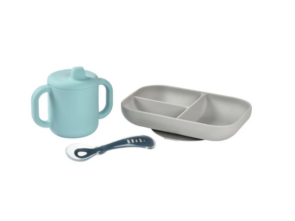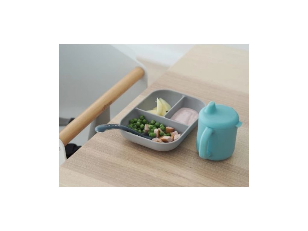 Sada děleného talíře, hrnku na pití a lžičky z vysoce kvalitního silikonu je ideální pro první samostatné krmení. Přísavka u talíře umožňuje uchycení ke stolu nebo pultu jídelní židličky.