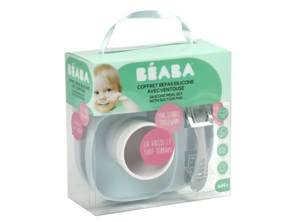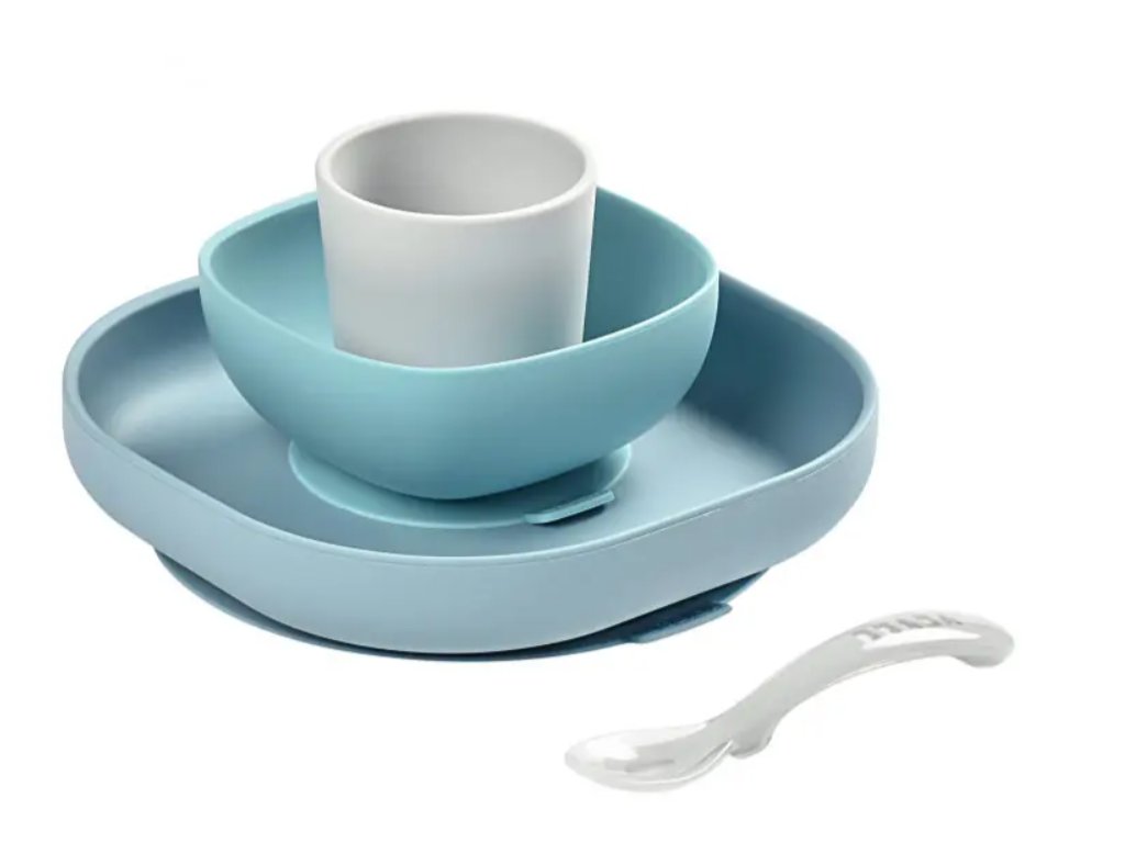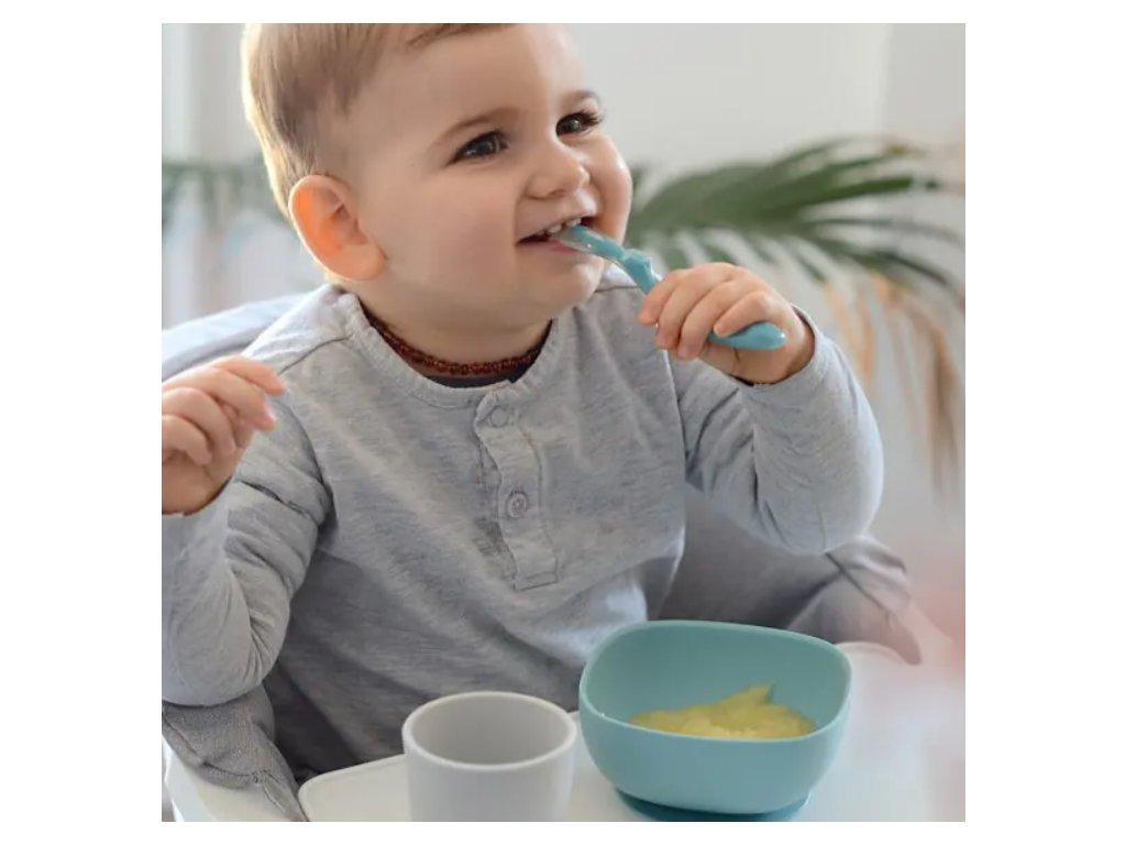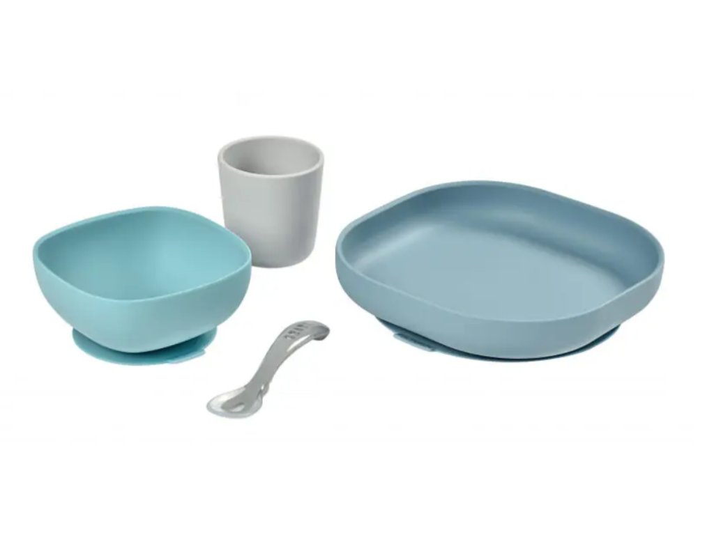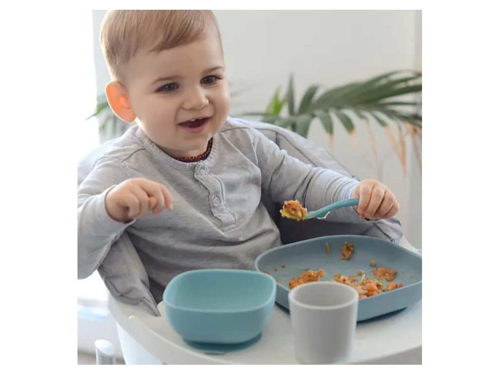 Sada talíře, misky, kelímku na pití a lžičky z vysoce kvalitního silikonu je ideální pro první samostatné krmení. Přísavka u misky a talíře umožňuje uchycení ke stolu nebo pultu jídelní židličky. Ergonomický tvar usnadňuje nabírání příkrmu.