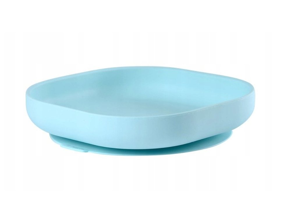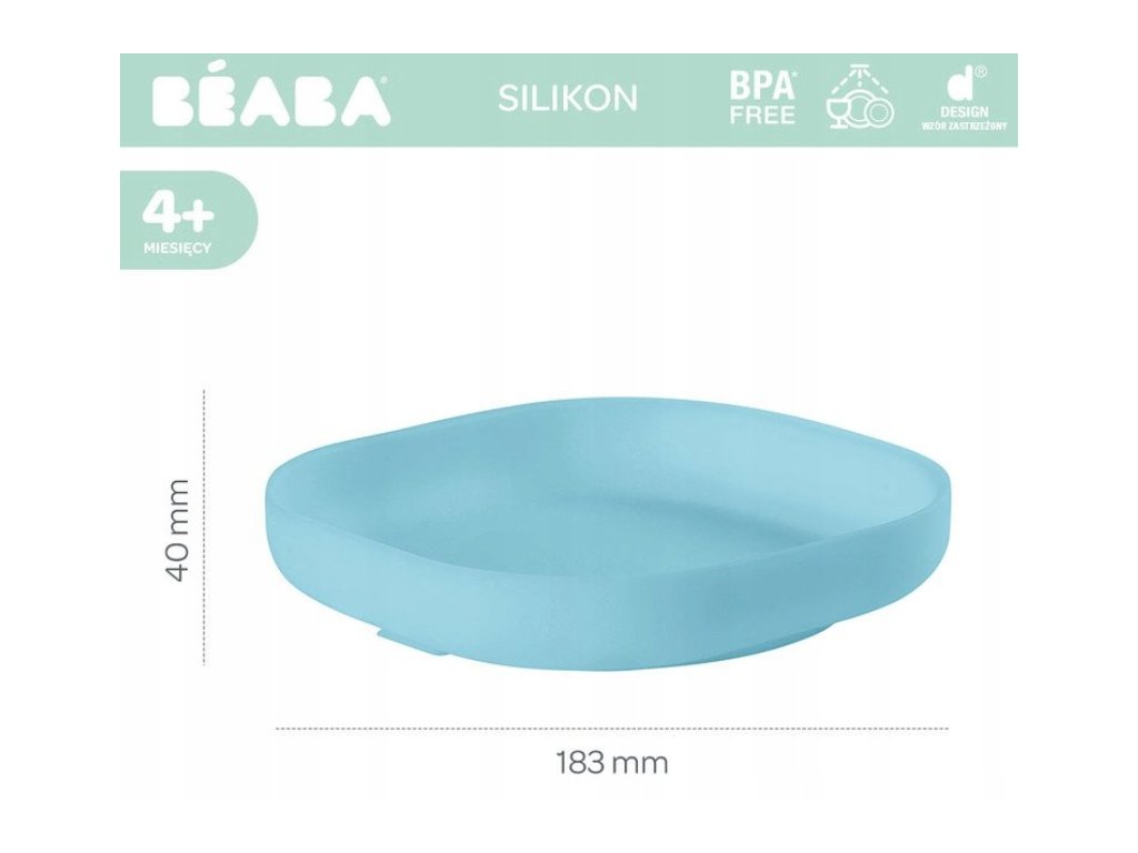Silikonový talířek s přísavkou od francouzské značky BEABA má ergonomický čtvercový tvar s vysokými, po stranách zaoblenými okraji, které usnadňují dítěti samostatné nabírání jídla na vidličku nebo lžíci. Nádoba má na spodní straně protiskluzovou přísavku, díky čemuž je stabilní a dobře drží na stole. Talířek má světle modrou barvu. Lze jej mýt ručně i v myčce nádobí a také ohřívat v mikrovlnné troubě.