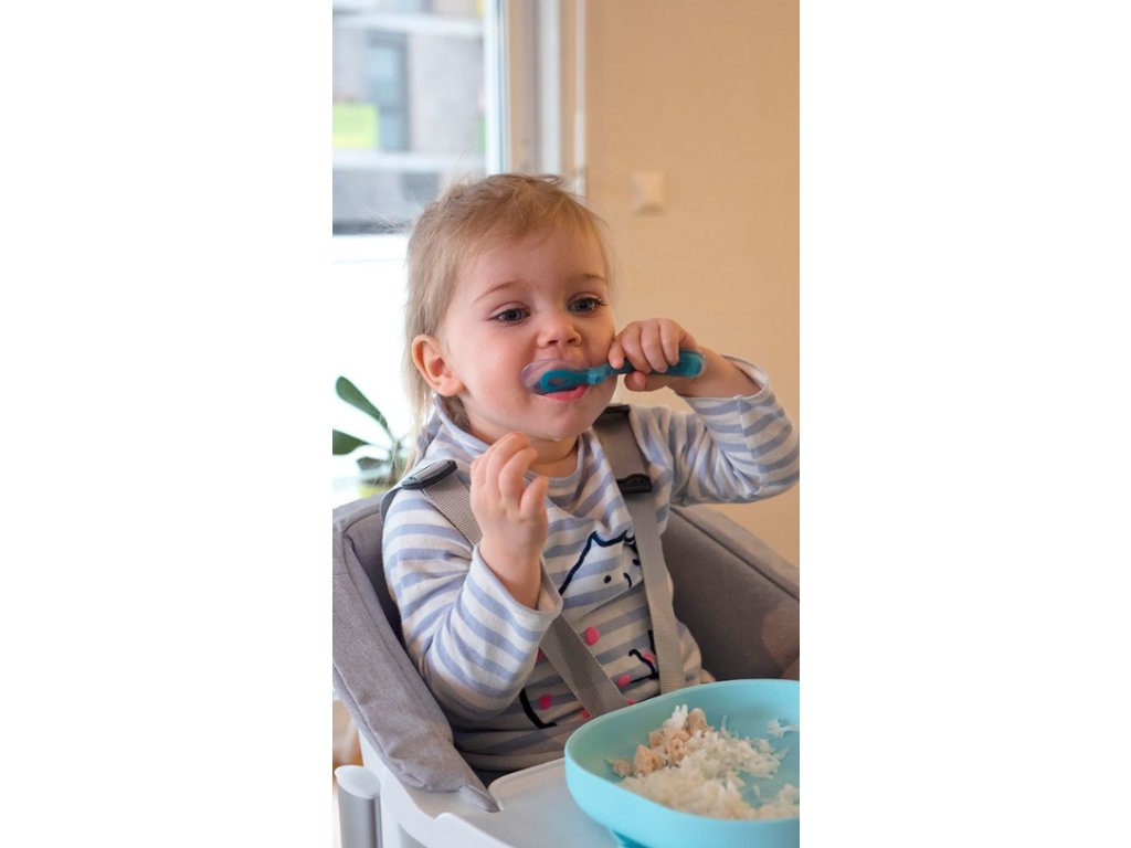 Silikonový talířek s přísavkou od francouzské značky BEABA má ergonomický čtvercový tvar s vysokými, po stranách zaoblenými okraji, které usnadňují dítěti samostatné nabírání jídla na vidličku nebo lžíci.