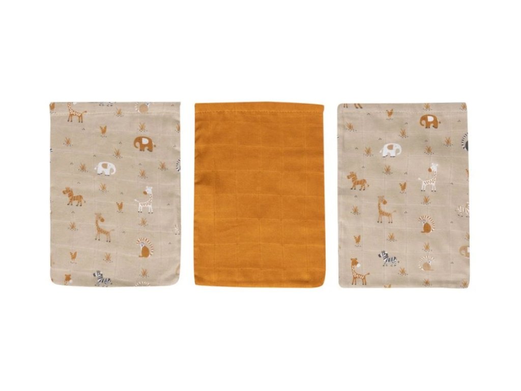 Sada tří kusů dětských mycích žínek z mušelínu s bambusovým vláknem od Bébé-jou. Vyrobeno z unikátního materiálu s vysokým obsahem bambusové viskózy, která je známa vyšší odolnosti (o 60-70% ve srovnání s bavlnou) proti bakteriím.