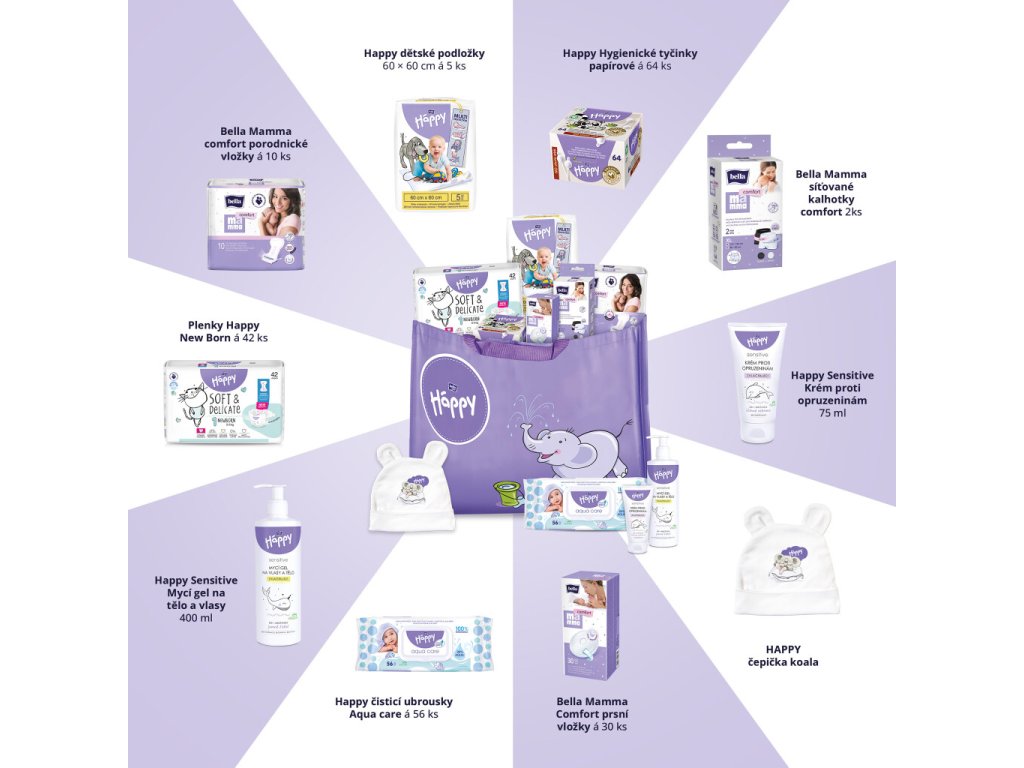 Vše pro první dny po porodu v jednom balíčku pro maminku a miminko. Porodnický balíček Bella Baby Happy je ideálním řešením pro maminky, které se připravují na porod nebo jsou právě po něm. Obsahuje pečlivě vybrané produkty pro péči o miminko i o sebe