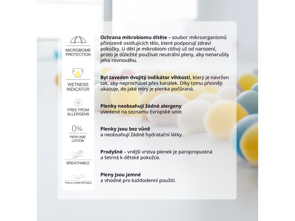 - Nechceme nikoho dráždit - Plenky nejsou parfemovány a neobsahují alergeny a jsou tedy vhodné i pro velmi citlivou pokožku miminka.