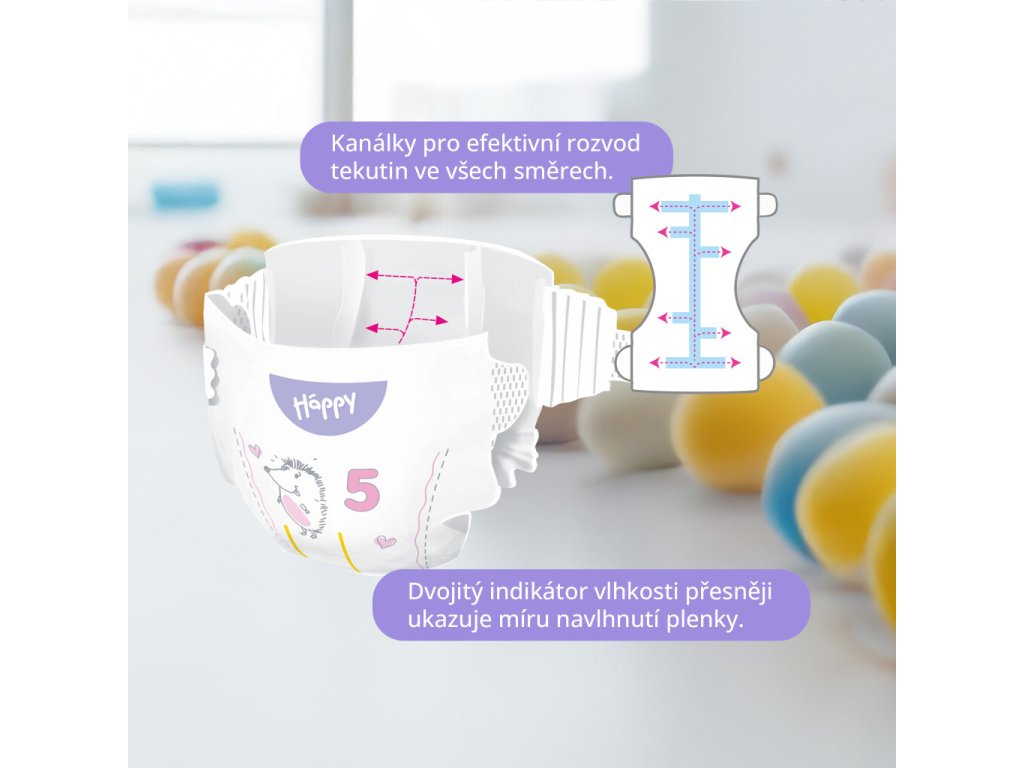 Účinná ochrana proti vlhkosti - Savé jádro plenek Happy SOFT & DELICATE se superabsorbentem okamžitě absorbuje veškerou tekutinu a pokožka vašeho dítěte tak zůstává suchá.