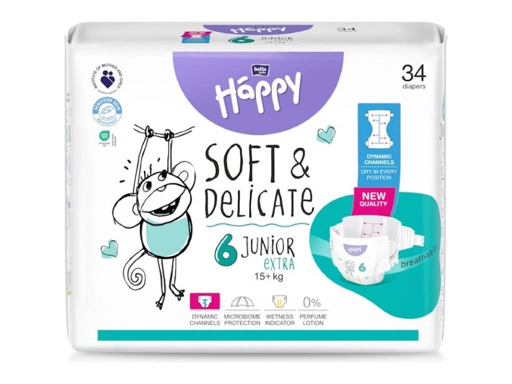Dětské pleny Happy Soft & Delicate Junior Extra jsou doporučeny pro novorozence s hmotností 15+kg. Jsou vyrobeny z nejkvalitnějších materiálů, dokonale se přizpůsobí tělu dítěte a poskytují příjemný pocit sucha. Jsou navrženy tak, aby vyhovovaly potřebám té nejcitlivější pokožky – neobsahují žádné alergeny a minimalizují riziko vzniku opruzenin.