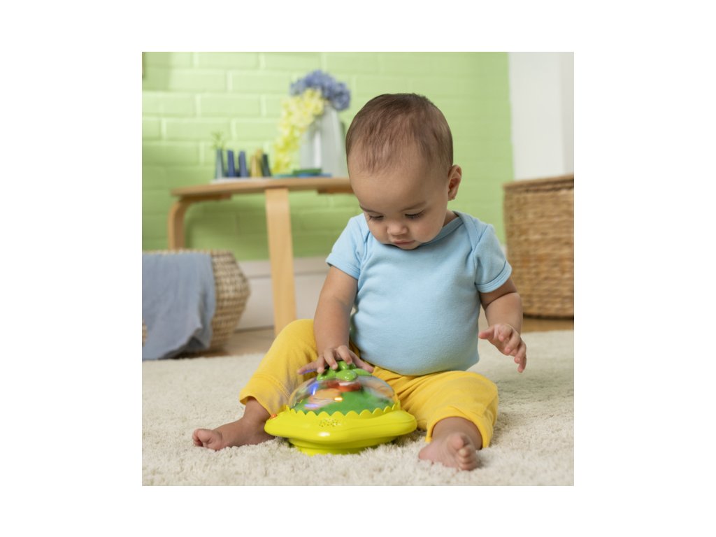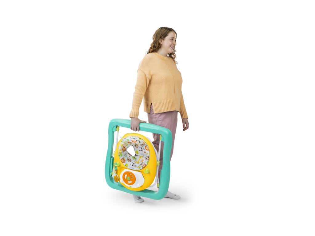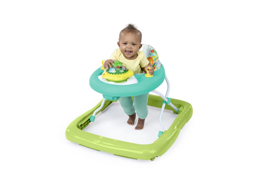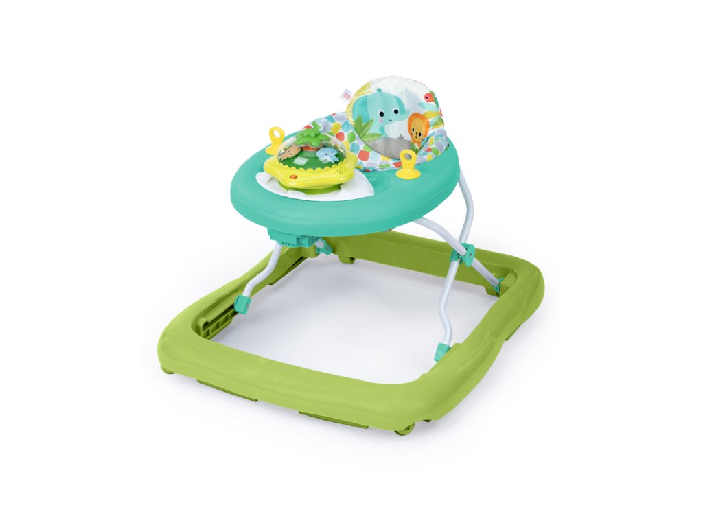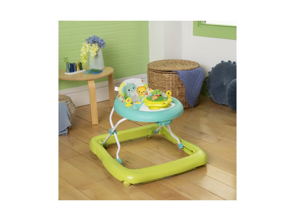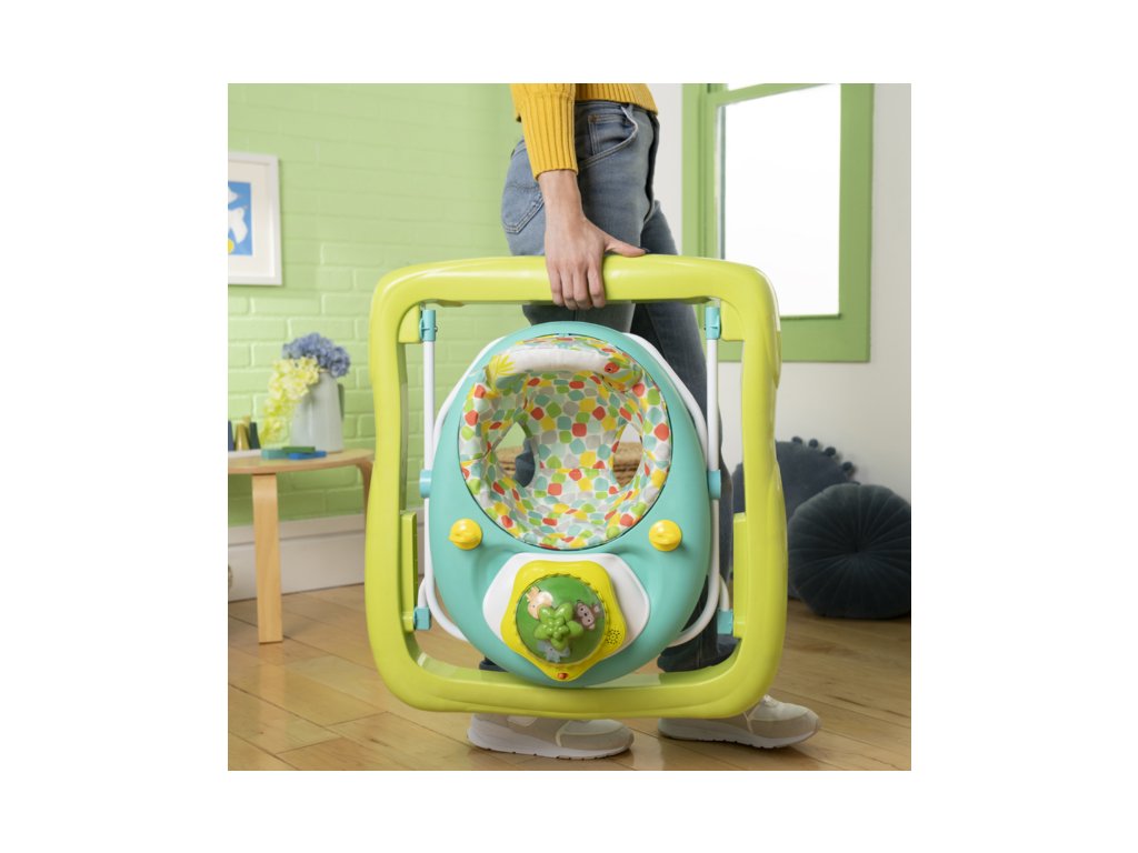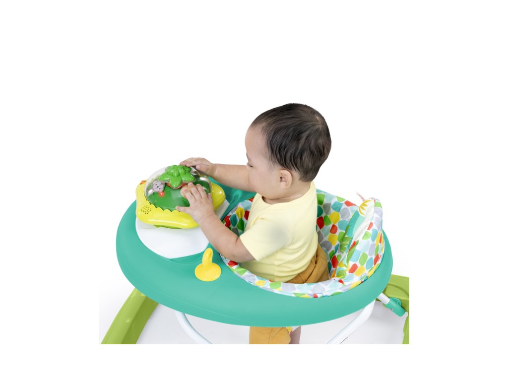 Rozhýbejte první krůčky svého dítěte s barevným a zábavným chodítkem! Pomáhá miminkům rozvíjet první kroky, objevování a nezávislost. Chodítko odměňuje děťátko světýlky a zvuky při každém pokusu o krok a obsahuje i odnímatelnou svítící a točící se hračku - opičku, kterou lze používat ve dvou režimech jako součást chodítka nebo samostatně na hraní na podlaze. Obsahuje více než 20 minut hudby, které spolu se světly a pohybem pomáhají rozvíjet hrubou a jemnou motoriku. Dítě se učí principu příčina – následek mačkáním tlačítka na vrchu hračky. Pro ještě více zábavy můžete připojit také oblíbené hračky pomocí 2 upevňovacích kroužků. Díky 3 nastavitelným výškám roste chodítko spolu s dítětem od 6 do 18 měsíců (nebo dokud nezačne samostatně chodit). Měkká sedací podložka je pratelná v pračce a celý rám lze sklopit pro jednoduché skladování či cestování. V zářivém tropickém designu s ovocnými barvami a vzory. Hračka vyžaduje 3 AA baterie (nejsou součástí balení).