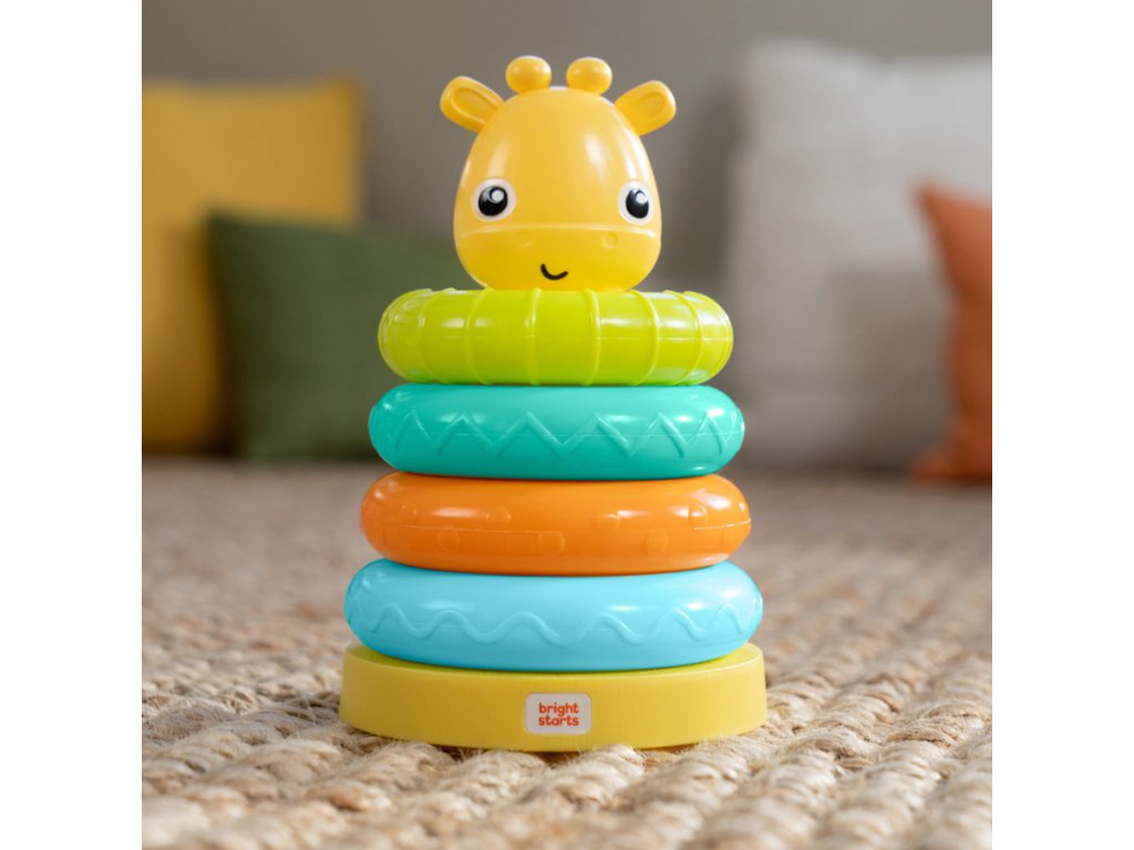 Objevte nové výšky hravosti se stohovací žirafou od Bright Starts – zábavnou a rozkošnou věží s kroužky, kterou si vaše děťátko zamiluje! Lehké, barevné kroužky se ukládají jeden na druhý směrem k usměvavé tváři žirafy, čímž podporují rozvoj jemné motoriky a koordinace ruka-oko. Každý kroužek má jiný povrch a barvu, což stimuluje smysly a pomáhá dětem objevovat nové textury a barevné kombinace. Tato interaktivní hračka podporuje kognitivní vývoj – dítě se učí, jak do sebe jednotlivé části zapadají a v jakém pořadí.