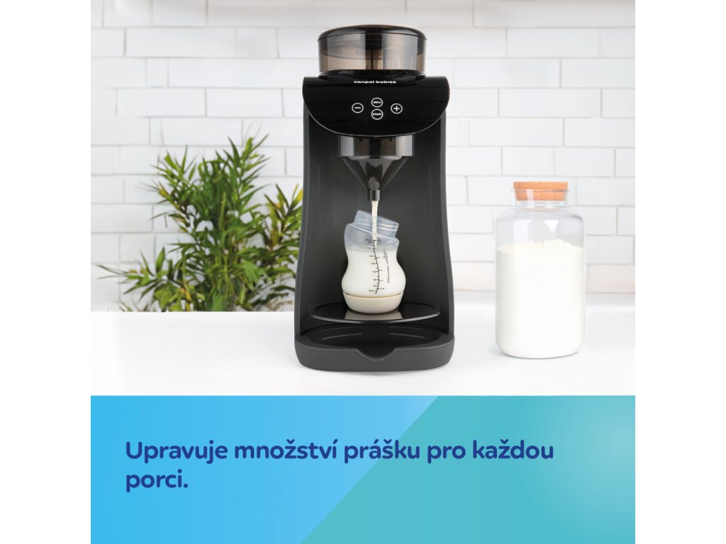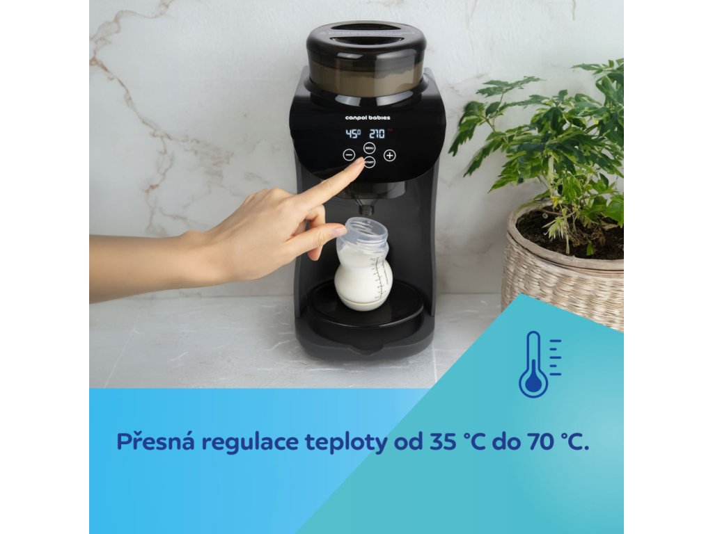 Přístroj automaticky odměřuje, ohřívá a míchá mléčnou formuli. S nastavitelnou teplotou vody od 35 °C do 70 °C lze zvolit ideální teplotu pro potřeby svého miminka.