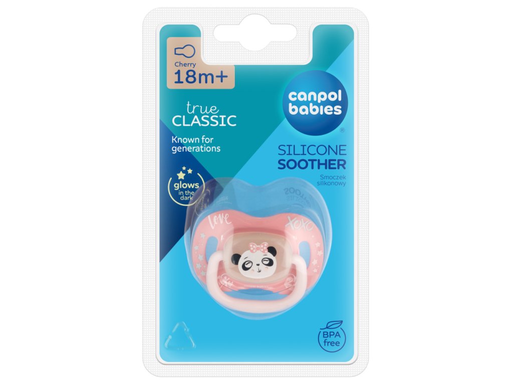 Dudlík se silikonovou špičkou ve tvaru třešinky (kulatý tvar) vaše miminko uvolní a uklidní. Dudlík je vyroben ze 100% hypoalergenního silikonu, který je bez chuti a zápachu, což miminku usnadňuje přijetí dudlíku. Silikonová špička je pevná a odolná proti deformaci. Větrací otvory ve štítku umožňují průchod vzduchu a zabraňují podráždění jemné pokožky dítěte. Dudlík je bezpečný a snadno se udržuje v čistotě – vhodný pro opakovanou dezinfekci. Kromě toho má dudlík prvky svítící ve tmě, což usnadňuje jeho nalezení v noci. Při jeho výrobě nebyly použity BPA ani jiné škodlivé látky. Pohodlný úchyt dudlíku umožňuje připevnění na řetízek a usnadňuje jeho podávání vašemu dítěti. Dudlík se doporučuje pro děti ve věku 18m+ měsíců. Silikonový dudlík Canpol babies 18m+ třešinka EXOTIC ANIMALS je dostupný ve čtyřech veselých designech – vyberte si svůj oblíbený!