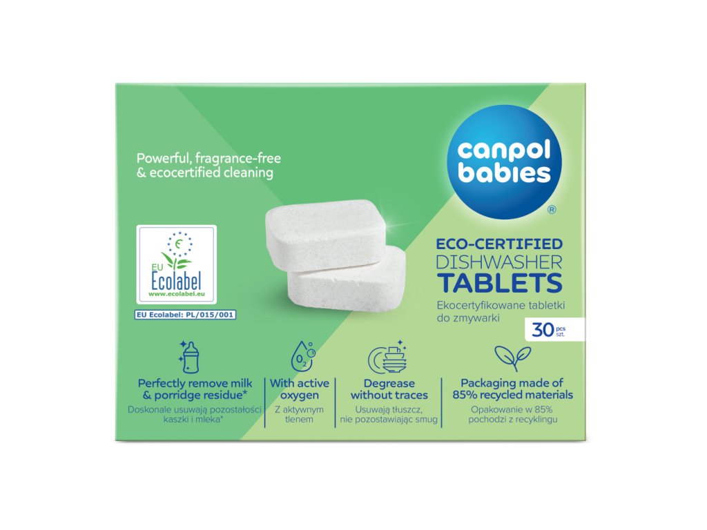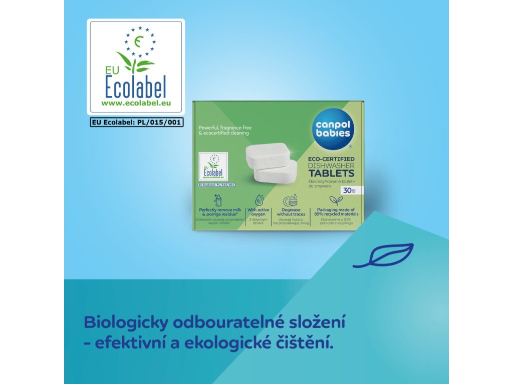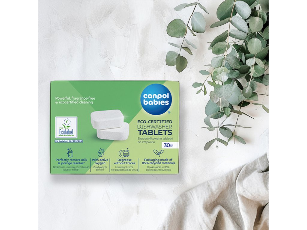 Ekologicky certifikované tablety do myčky Canpol babies vynikají zcela biologicky rozložitelným složením bez vůní a škodlivých chemikálií, jako jsou formaldehyd, reaktivní chlorové sloučeniny, boritany, EDTA nebo mikroplasty. Výrobek je bezpečný pro uživatele a šetrný k přírodě. Další výhodou je ekologicky uvědomělé balení – vyrobené z 85 % recyklovaných materiálů a plně recyklovatelné.
