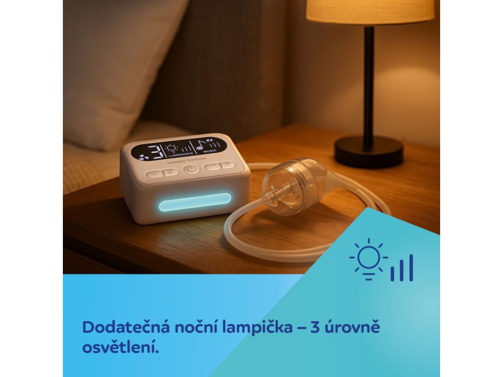 Tichý provoz a zabudovaná noční lampička se 3 úrovněmi jasu umožňují pohodlné použití i během spánku vašeho miminka.