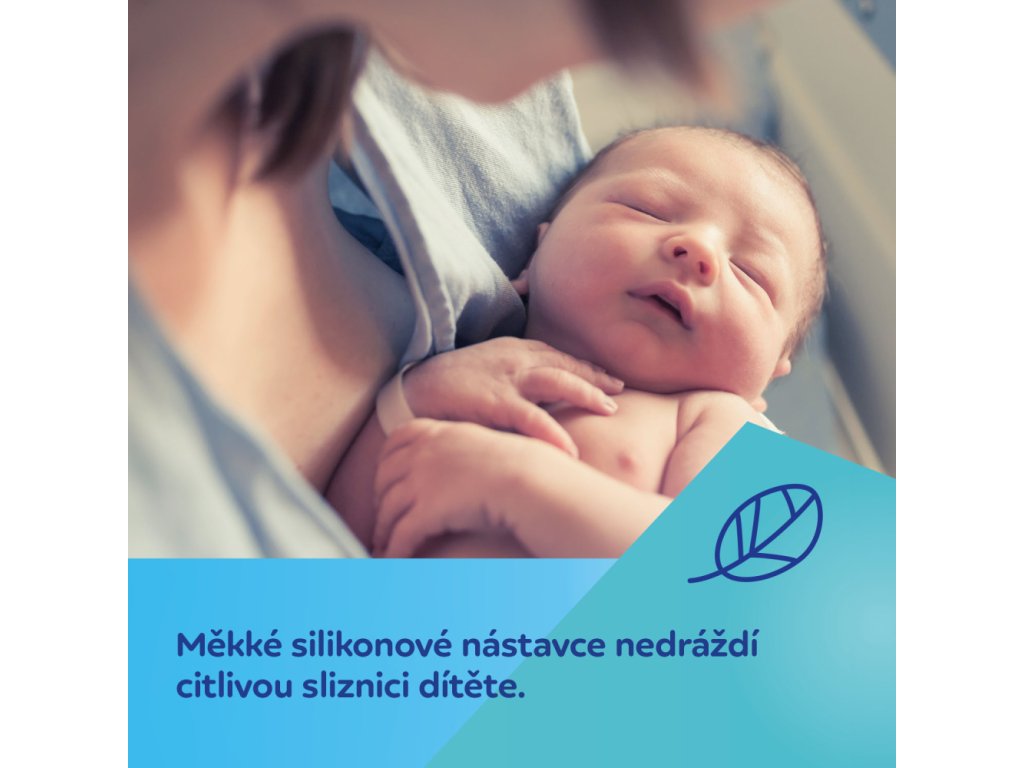 Součástí balení jsou 3 vyměnitelné silikonové nástavce různých tvarů navržené tak, aby se dokonale přizpůsobily citlivému dětskému nosu a účinně odstranily hlen pro snadnější dýchání. Měkký silikon chrání nosní sliznici a zabraňuje podráždění či poranění.