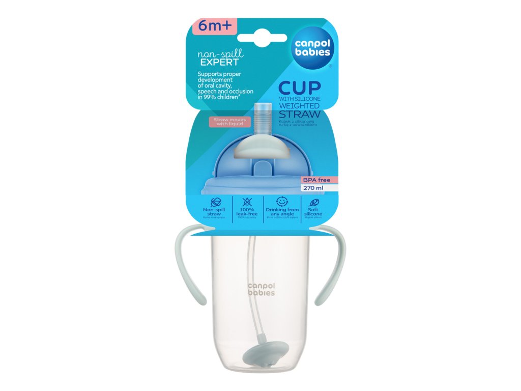 Nový nevylévací hrneček Canpol babies se slámkou a závažím je ideální na výlety, cesty a procházky. Speciální membrána ve slámce zajišťuje, že tekutina vtéká do slámky pouze při pití, což zabraňuje rozlití. Je ideální pro děti, které se začínají učit samostatně pít. Nevylévací hrneček se slámkou a závažím podporuje správný vývoj úst, řeči a okluze u 99 % dětí.* Závaží na konci slámky následuje pohyb tekutiny, takže vaše dítě může pít svůj oblíbený nápoj až do poslední kapky, bez ohledu na to, v jakém úhlu hrneček nakloní. Díky víčku lze slámku rychle a pohodlně stáhnout, čímž se zabrání nekontrolovanému rozlití a zaručí 100% těsnost. Měkká silikonová slámka je šetrná k citlivým dásním dítěte. Pro důkladné vyčištění můžete slámku rozebrat a umýt. Je dobré si pořídit speciální kartáč na čištění slámky i náhradní slámku. Nevylévací hrneček Canpol babies je vyroben z nerozbitného a bezpečného plastu (PP), bez BPA ani jiných škodlivých látek. Je trvanlivý, lehký a odolný proti poškození. Pohodlná rukojeť se dítěti snadno drží, zatímco velký otvor vám pomůže naplnit a umýt hrneček. Lze jej mýt v myčce na nádobí i ohřívat v mikrovlnné troubě. Vhodné pro studené nápoje nebo nápoje pokojové teploty. Praktický nevylévací hrneček Canpol babies se slámkou a závažím 270 ml povzbudí vaše dítě k pití vody a k rozvoji správných návyků. Nevylévací hrneček Canpol babies se slámkou a závažím 270 ml doporučujeme pro děti od 6 měsíců.