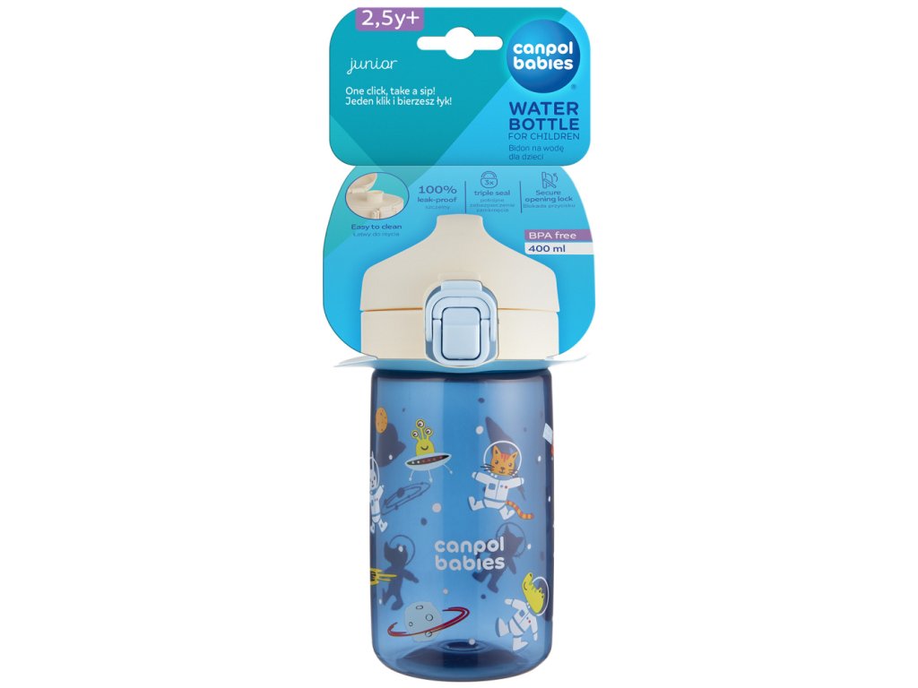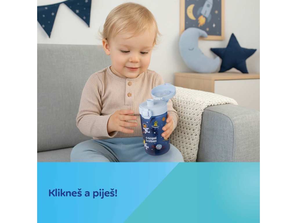Jednoduché ovládání jednou rukou – jedno kliknutí a pití je připraveno! Náustek je navržen tak, aby se snadno čistil i skladoval – bez brček a závaží. Láhev je vhodná do myčky nádobí (doporučujeme ekologické tablety do myčky Canpol babies – k.č. 1/502, bez barviv a parfemace).