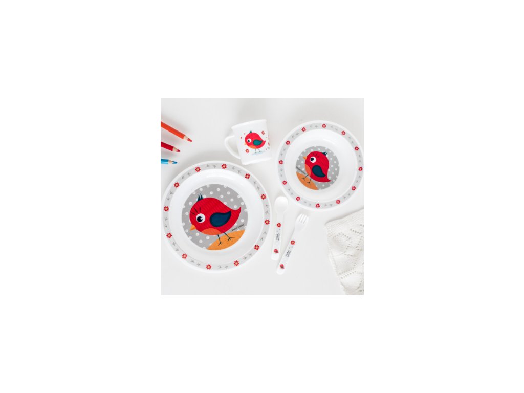 Plastová sada nádobí (miska, talíř, hrníček a příbor) je určena dětem starším jednoho roku.