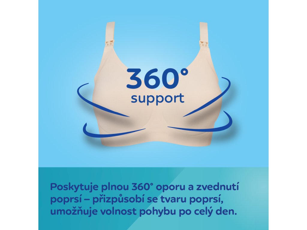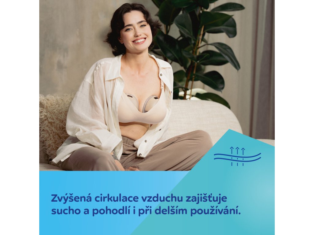 Integrované tvarovací vycpávky zůstávají na svém místě při nošení i praní. Podprsenka bezpečně udržuje odsávačku mateřského mléka a podporuje efektivní odsávání. Je příjemná na kůži a pohodlná i při spánku či nočním kojení. Zvýšená cirkulace vzduchu zajišťuje sucho a pohodlí i při delším sezení/odsávání.