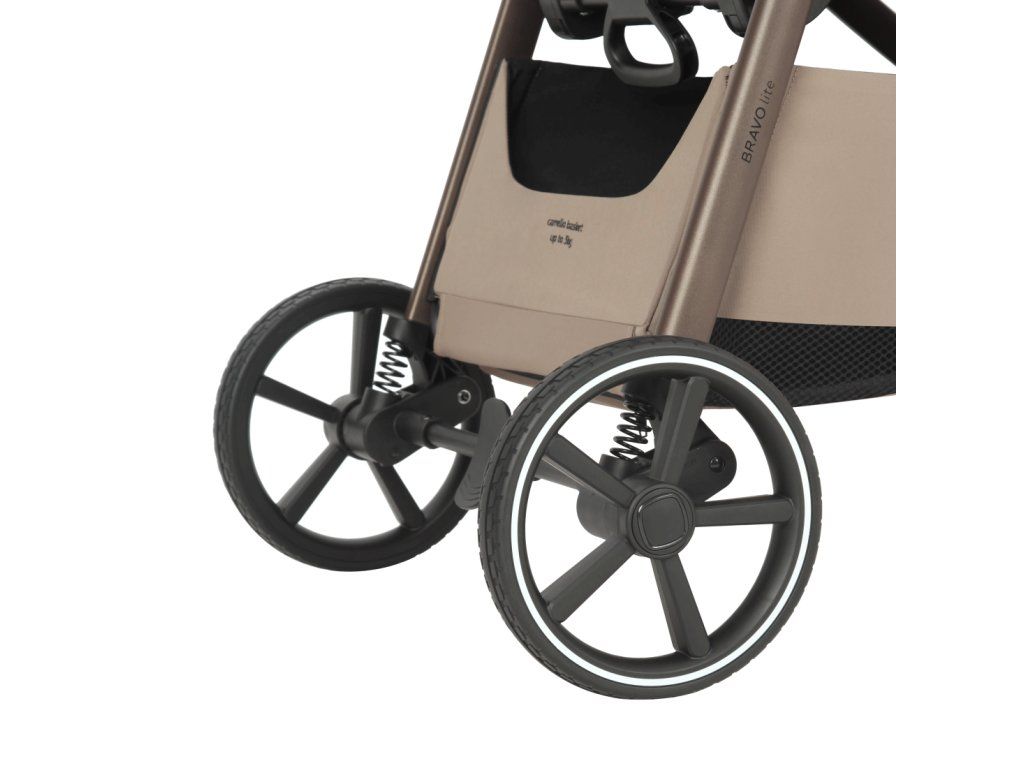 Kočárek se velmi lehce řídí díky velkým gumovým kolům s dezénem, odolným proti otěru. Přední kola mají blokovací mechanismus pro jízdu napřímo a vzadu je centrální brzda.