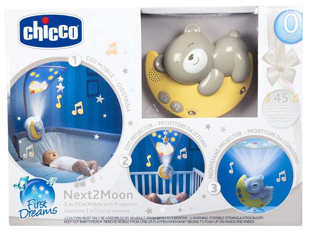Projektor Chicco Next2Moon je inovativní hračka nad postýlku sloužící ke zklidnění a uspání vašeho děťátka. Kombinuje magickou atmosféru projektoru a široké stříšky působící uklidňujícím dojmem na každé malé miminko, protože baldachýn simuluje uzavřenější ochranné prostředí (efekt kokonu, na který je zvyklé z maminčina bříška).