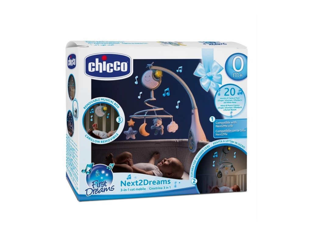 Výjimečný, všestranný hudební kolotoč na postýlku se světýlky, hudbou a otáčející se spirálou je jediný kolotoč kompatibilní s Next2Me postýlkami a zároveň vhodný na většinu dřevěných postýlek díky jednoduchému systému přichycení. Kromě hudebního kolotoče Next2Dreams poslouží také jako noční světlo a po odnětí kolotočového nástavce lze hrací a svítící skříňku zavěsit na bok postýlky, na úchyt autosedačky či do kočárku. Next2Dreams je blízko vás a snů vašeho děťátka.