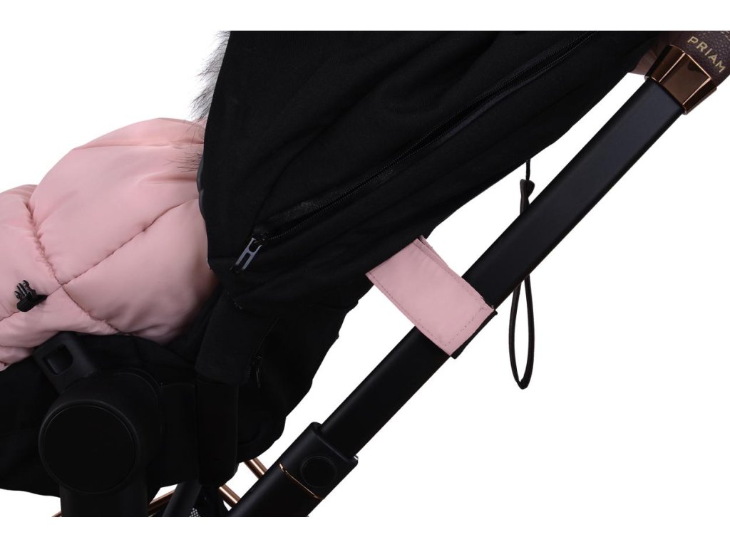 Kapuce je zdobená odepínatelnou ekologickou kožešinou, která je měkká, hypoalergenní a stylová. Pomocí stahovací šňůrky lze upravit velikost kapuce. Spodní část fusaku má rozšířené záševky pro více prostoru na nožky a vnitřní odolnou látku, která chrání fusak před špinavými botkami.