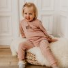 Dětské teplákové legíny. Legíny jsou vyrobeny z měkké a na dotek příjemné bavlněné mikiny. V pase legín je gumička, která netlačí miminko na bříško. Na zadní straně legín jsou krásné volánky. Maminky rády vybírají dětské legíny, ideální na hraní nebo na procházku. Legíny můžeme sladit s tunikou ze stejné kolekce nebo s mikinovými šaty.
