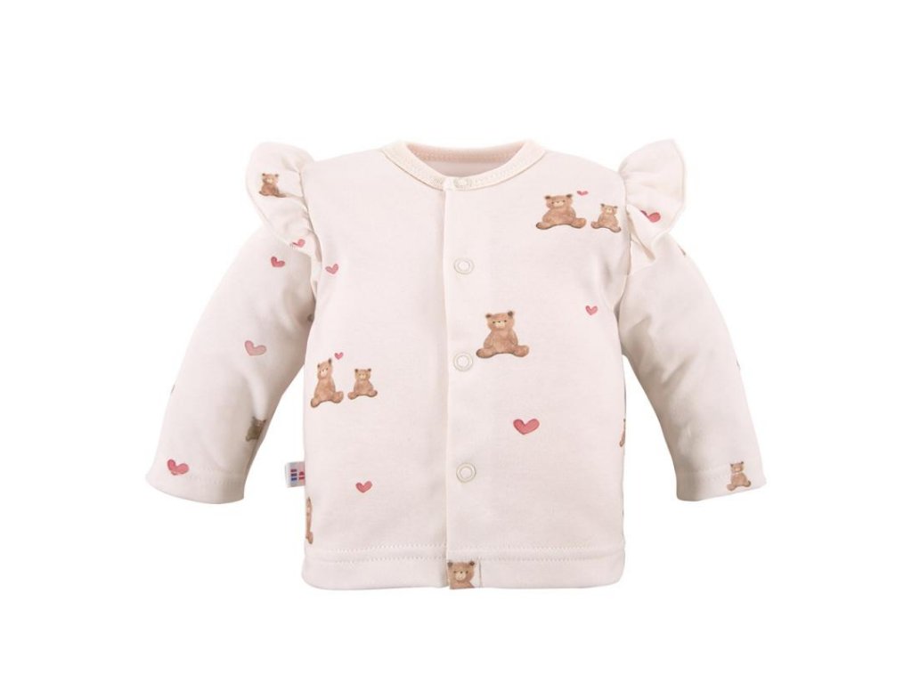 Kabátek pro miminko s jemným potiskem je ideální volbou pro první měsíce. Díky měkkému materiálu a praktickému zapínání je pohodlný na nošení i oblékání.