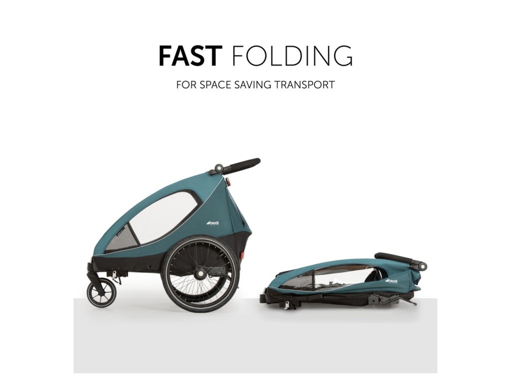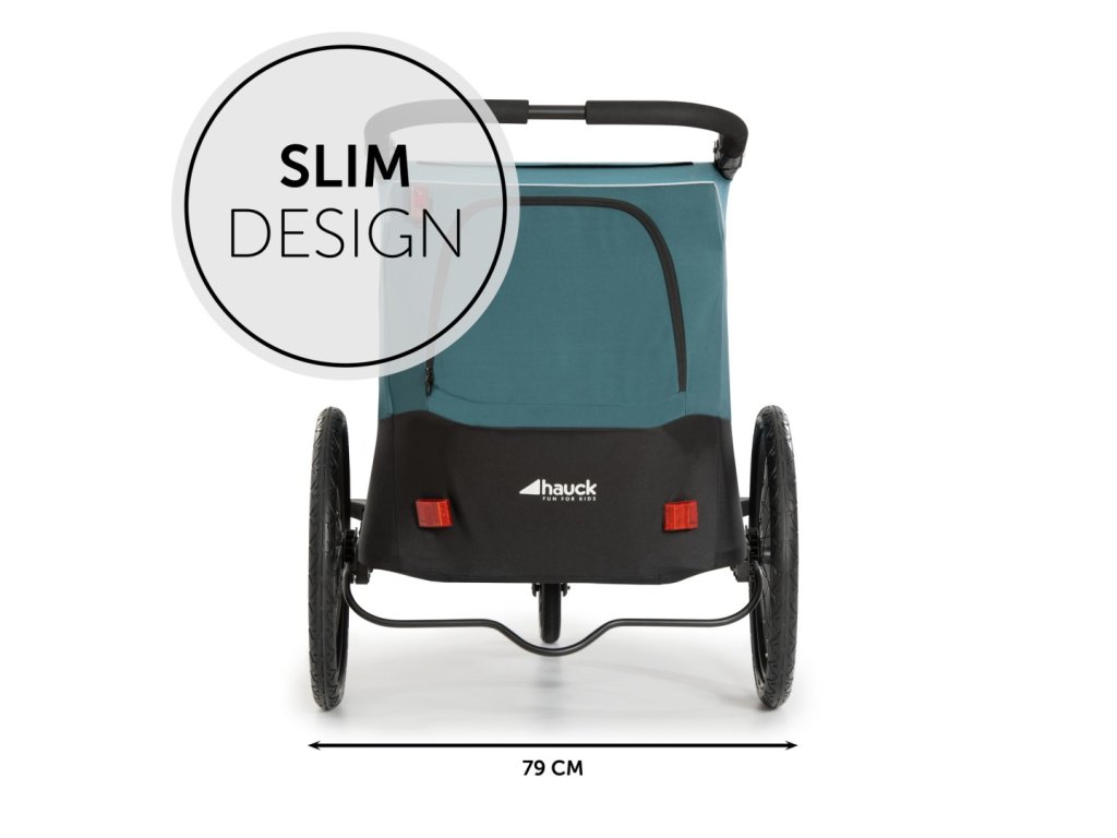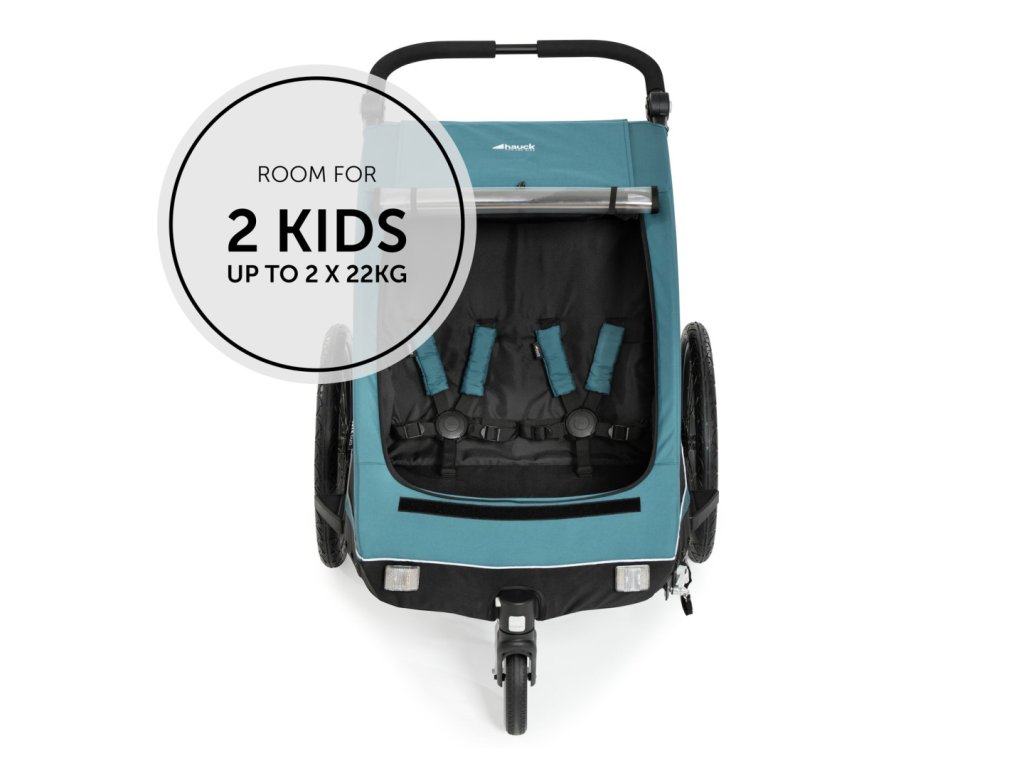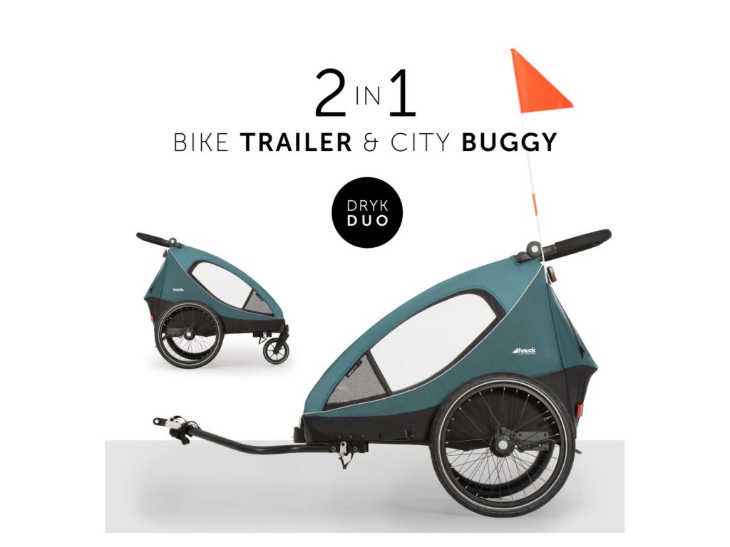 DRYK DUOHauck DRYK DUO – prvotřídní poměr cena/výkon ve sportovním designuDRYK DUO ohromí tím, jak úzkými prostory projede jako vozík za kolo i jako kočárek ve městě. Zajišťuje dětem bezpečnou a pohodlnou jízdu. Nabízí mimořádně snadnou obsluhu díky funkci One-Hand Fold.Díky prostornému designu představuje pohodlnou dvoumístnou sedačku pro děti od 6 měsíců do 120 cm, přičemž každé může vážit až 22 kg. Díky snadnému připojování a odpojování a přeměně v pouhých 3 krocích můžete kdykoli přecházet mezi režimem cyklovozíku a režimem kočárku. Šedá funkční tlačítka vám usnadní ovládání.Přední gumové kolo s aretací a zadní kola plněná vzduchem zajišťují vysokou úroveň jízdního komfortu a příjemnou plynulost pohybu. Velkou stříšku 2 v 1 lze podle potřeby srolovat. Boční okna 2 v 1 zajišťují optimální cirkulaci vzduchu. Své děti máte vždy na očích díky hornímu průzoru.S nosností 6 kg nabízí DRYK DUO maximální úložný prostor, který je snadno přístupný a uzavíratelný. Přední kolo a oj lze uložit do dvou tašek (součástí), které ochrání látku před znečištěním. Zároveň máte vše po ruce, pokud chcete na cestách přejít do druhého režimu. Rychle lze také upravit výškově nastavitelnou rukojeť.Díky komplexnímu bezpečnostnímu balíčku jste vy i vaše děti na cestách vždy v bezpečí. Součástí výbavy jsou čtyři odrazky, LED světlo, reflexní čáry na kolech a potahu a praporek. Balíček doplňují snadno nastavitelné pětibodové bezpečnostní pásy a zajišťovací brzda.