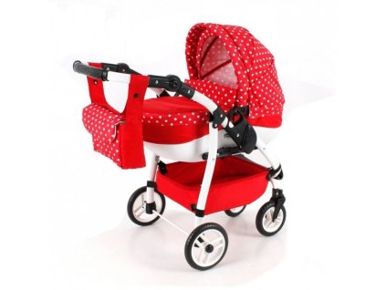 Červený kočárek pro panenky s otočnými koly pro pohodovou jízdu každé malé holčičky. Větší kočárek pro děti s velkou a pevnou vaničkou.