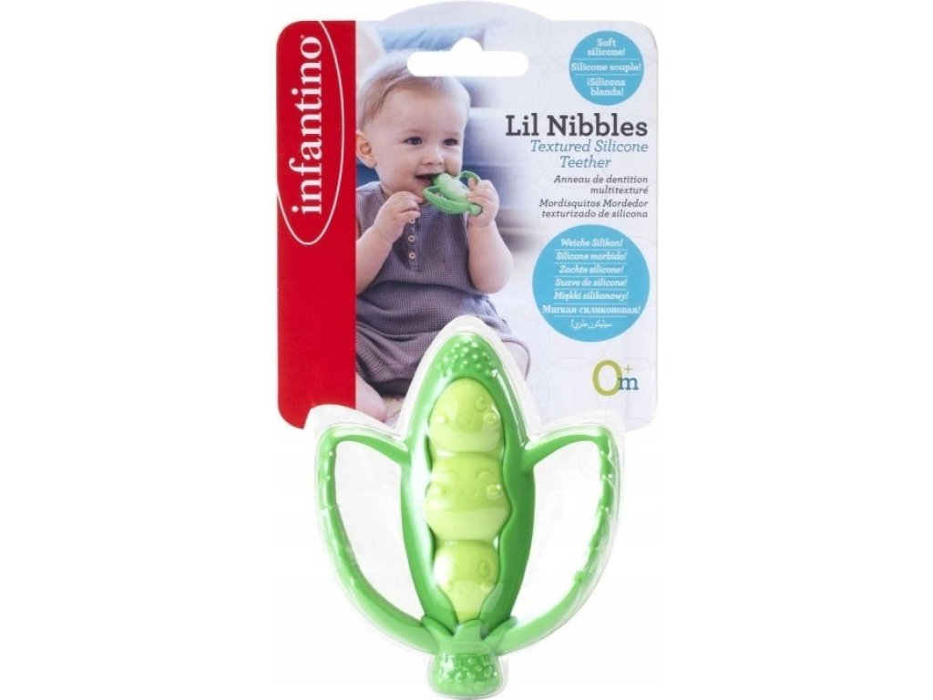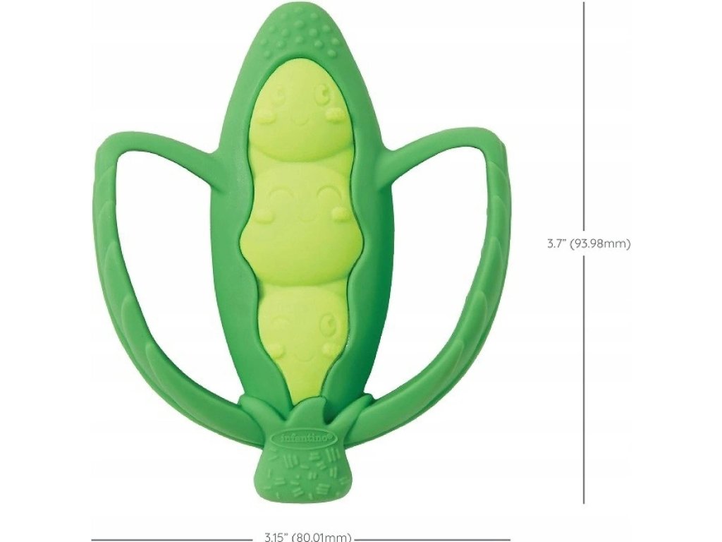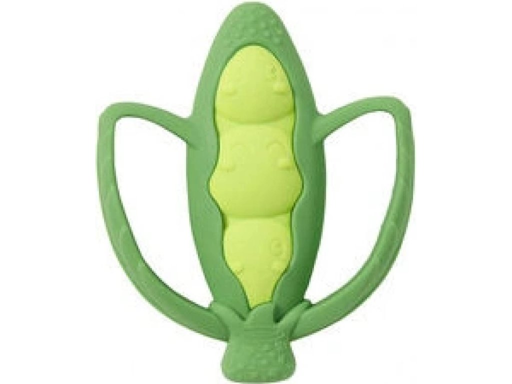 Rozkošné kousátko v podobě hrachového lusku je vyrobeno z pružného měkkého silikonu. Různorodé textury lákají dítě ke zkoumání v ústech, masírováním dásní kousátko pomáhá dítěti při prořezávání prvních zoubků.