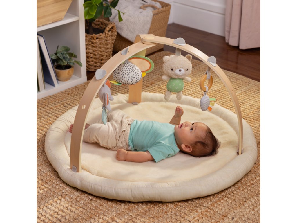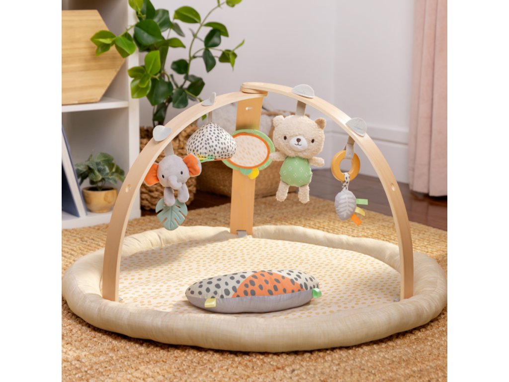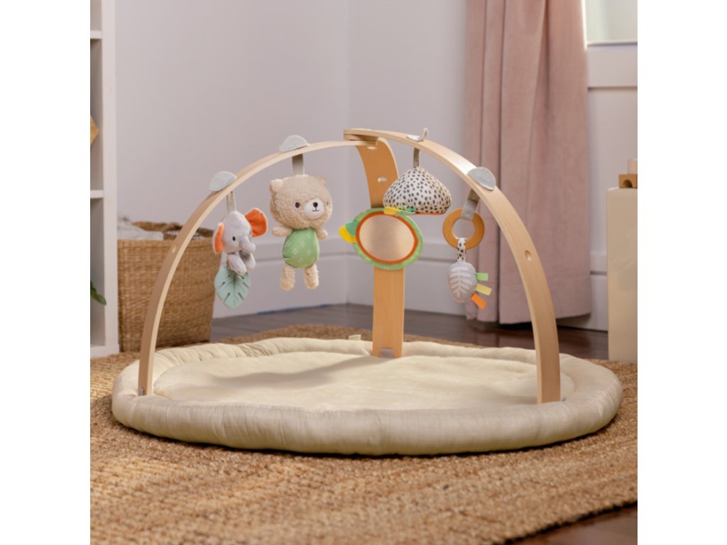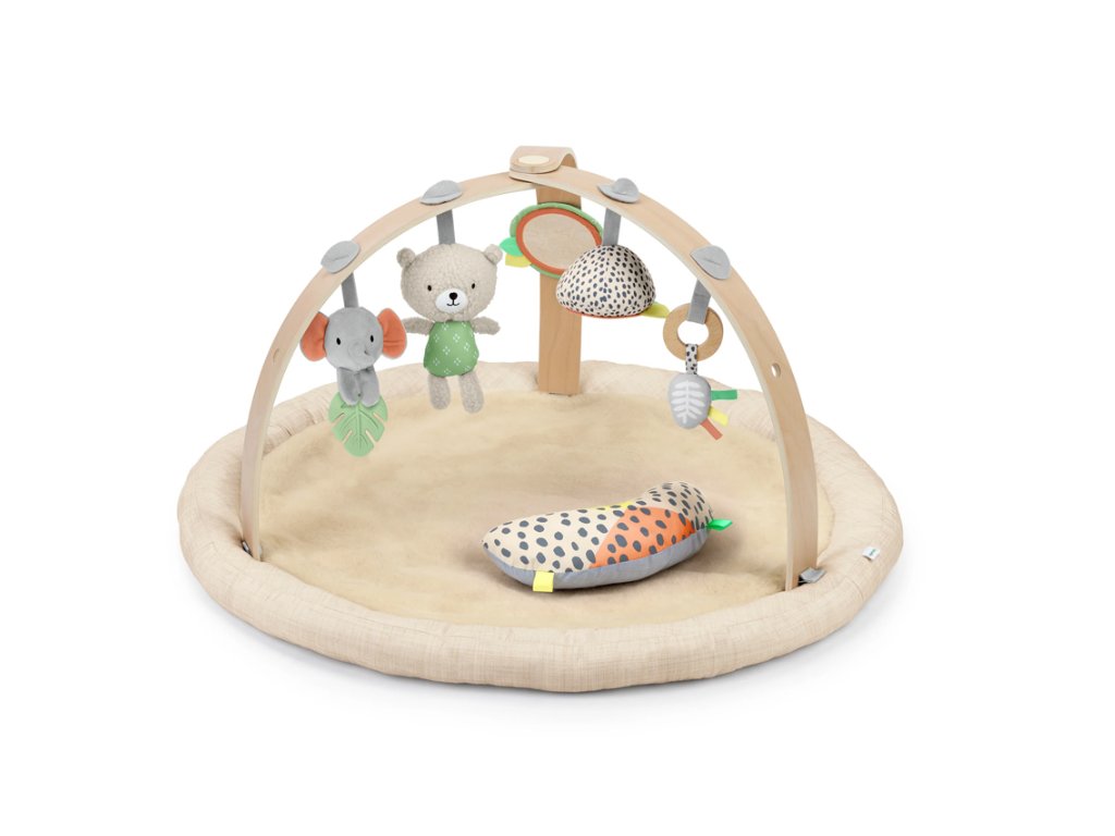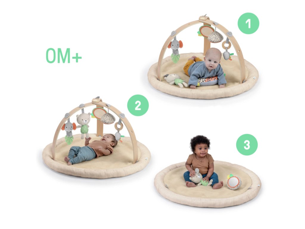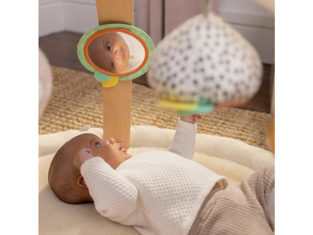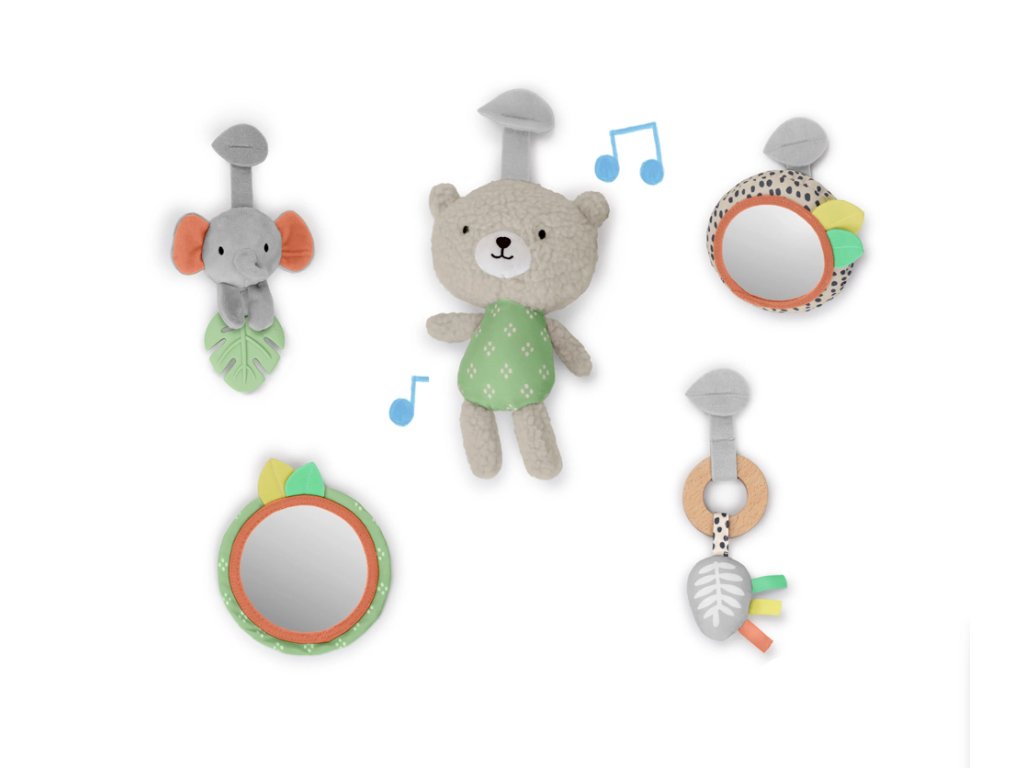 Dřevěná odnímatelná hrazdička obsahuje 5 různých hraček, které nabízejí děťátku plno zábavy. Dokonce si je snadno mohou vzít kamkoli s sebou. Dvě plyšové hračky medvídek a slůně, dřevěný kroužek se senzorickou stužkou a dvě zrcadlové hračky podporující sebe-objevování děťátka.