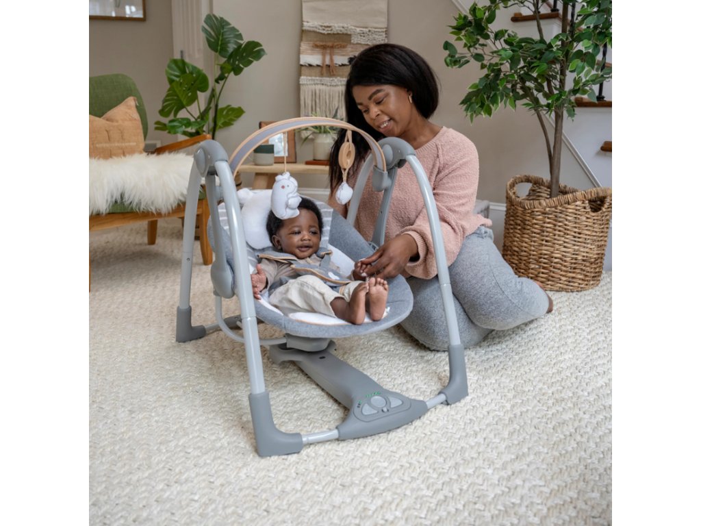 Když máte před sebou cestu, přenosná houpačka Ingenuity Swing'n Go Vám bude věrným společníkem. Kompaktní konstrukce se snadno přenáší a nabízí všechny funkce, které byste očekávali od plnohodnotné houpačky. Vaše miminko si může užívat automatické houpací pohyby, poslouchat uklidňující zvuky přírody a melodie a sahat po dvou plyšových závěsných hračkách – roztomilém plyšovém medvídkovi a obláčku.