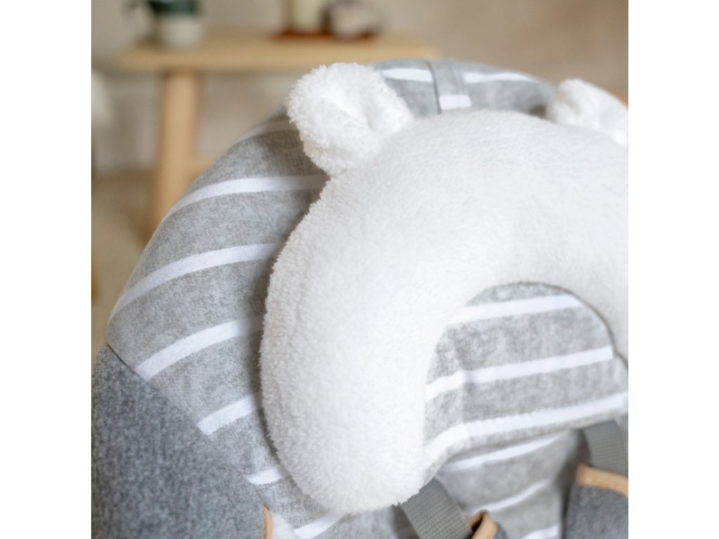 - Pratelný potah sedáku a opěrka hlavy; odnímatelná opěrka hlavy pro rostoucí miminko; 2 plyšové hračky – medvídek a obláček.