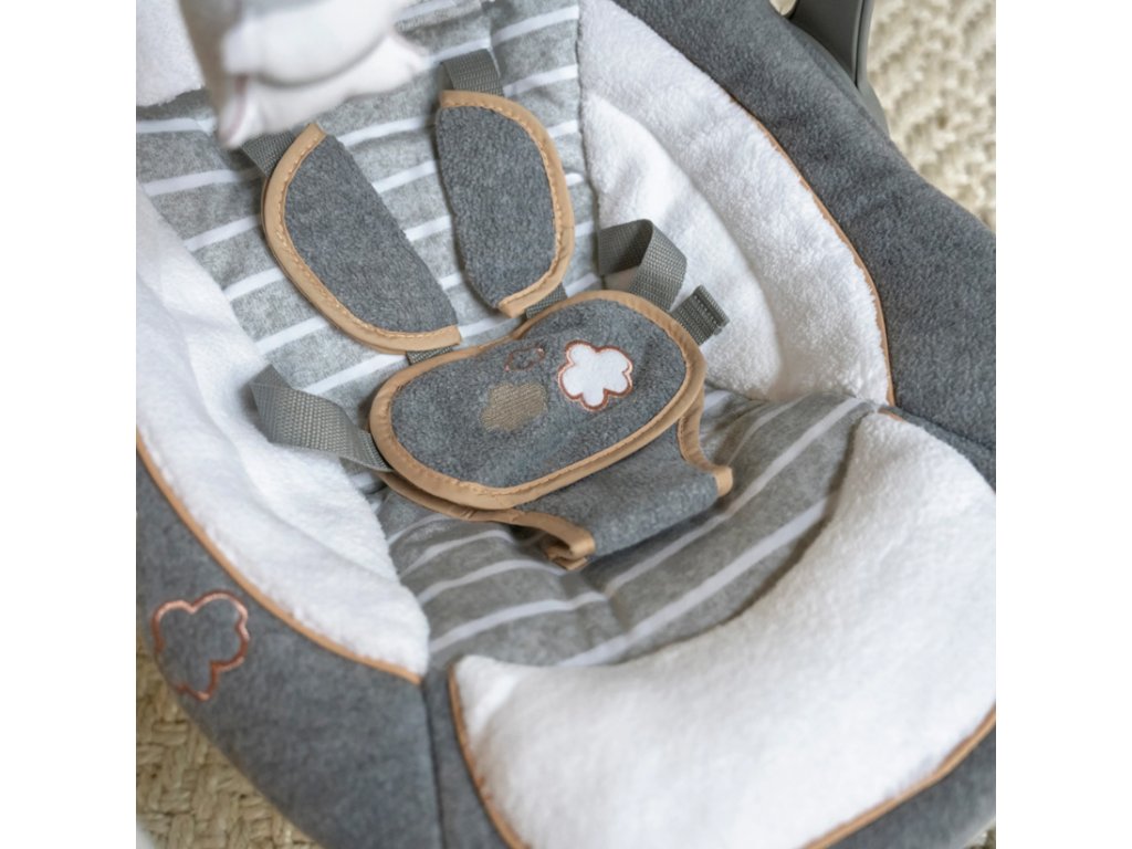 Houpačka v designu Bella Teddy je vyrobena z prémiových luxusních tkanin, které jsou mimořádně měkké a pohodlné, ale zároveň praktické. Jemné materiály hýčkají miminko, přičemž dodatečná výztuž a opěrka hlavy poskytují podporu menším dětem, které jednoduše odstraníte, když miminko vyroste. I 5-bodový bezpečnostní pás je obalen jemnou měkkou tkaninou, aby chránil citlivou dětskou pokožku.