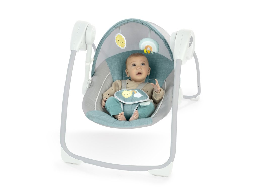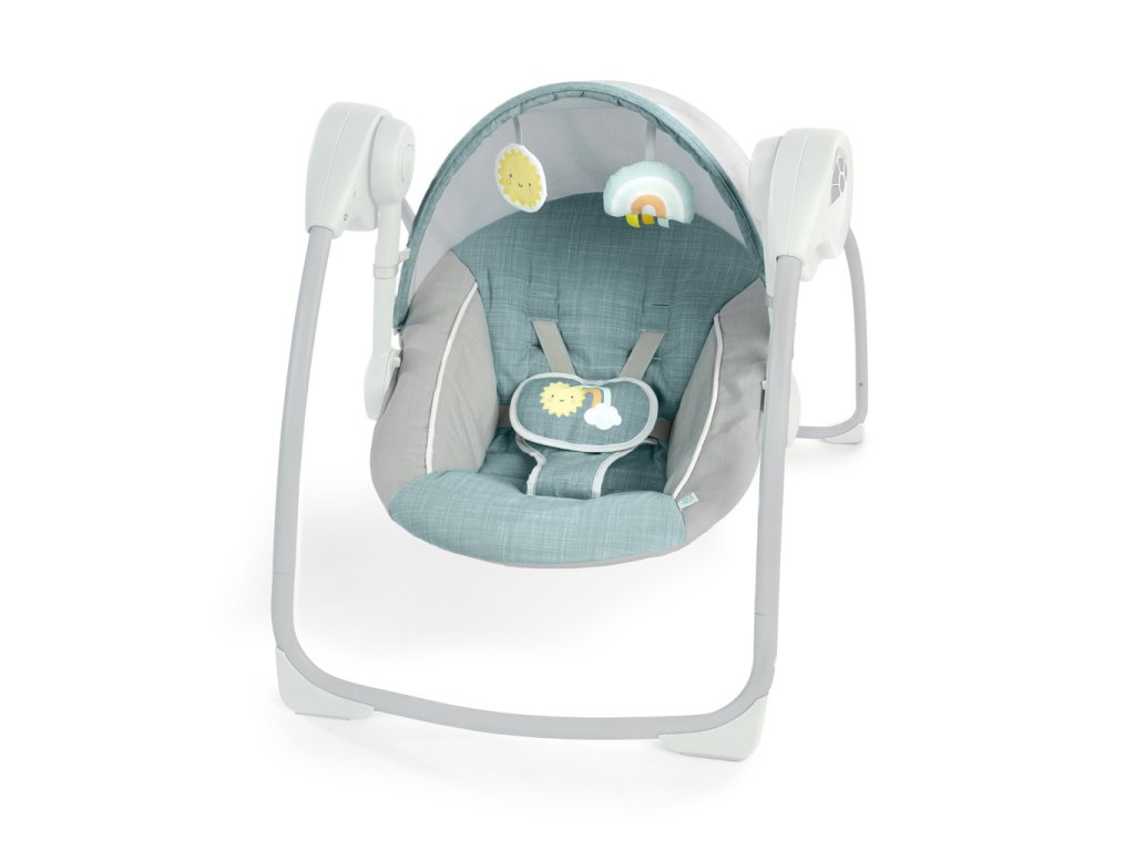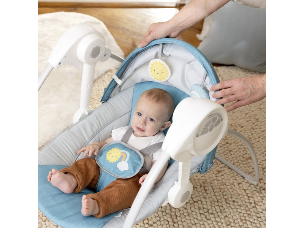 Tato přenosná kompaktní houpačka ity by Ingenuity Sun Valley Canopy je připravena vyrazit na cestu a zabavit děťátko na cestách se 2 hračkami (1 slunce a 1 plyšová duha).