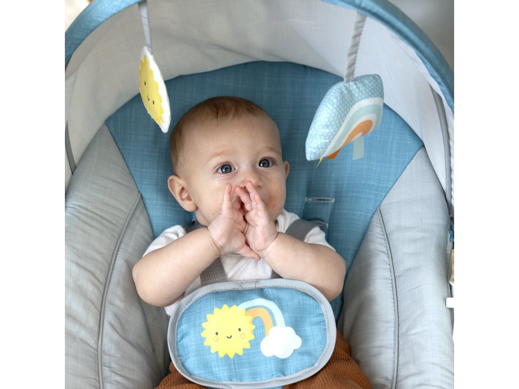 Tato přenosná kompaktní houpačka je připravena vyrazit na cestu a zabavit děťátko na cestách se 2 hračkami (1 slunce a 1 plyšová duha).