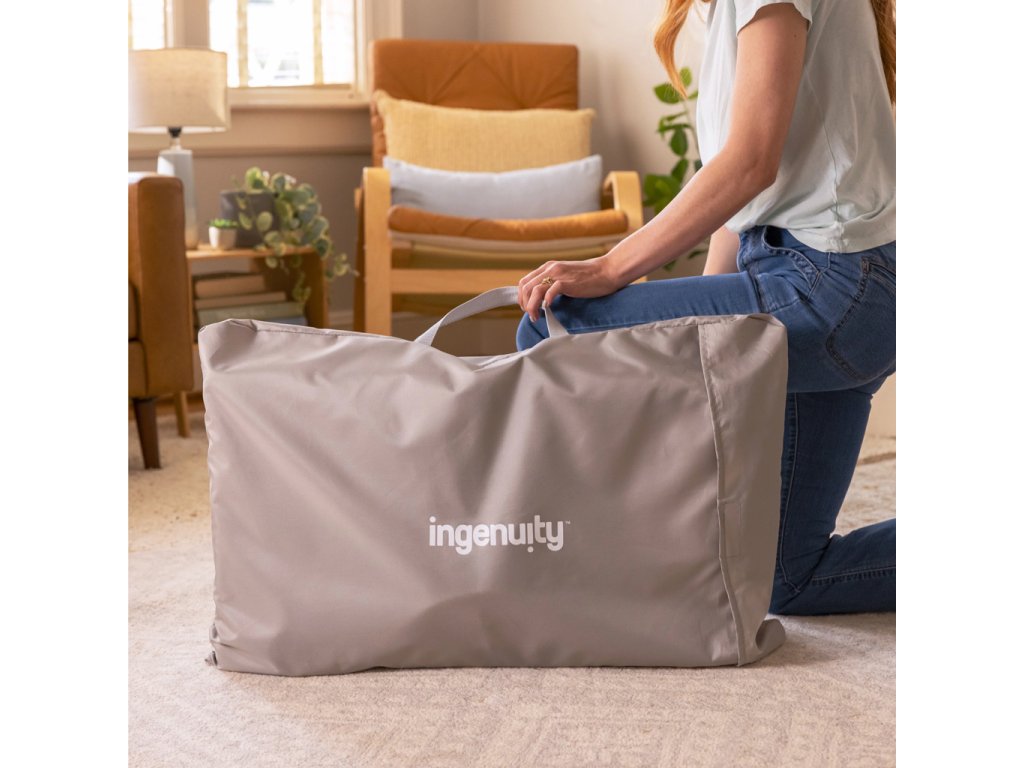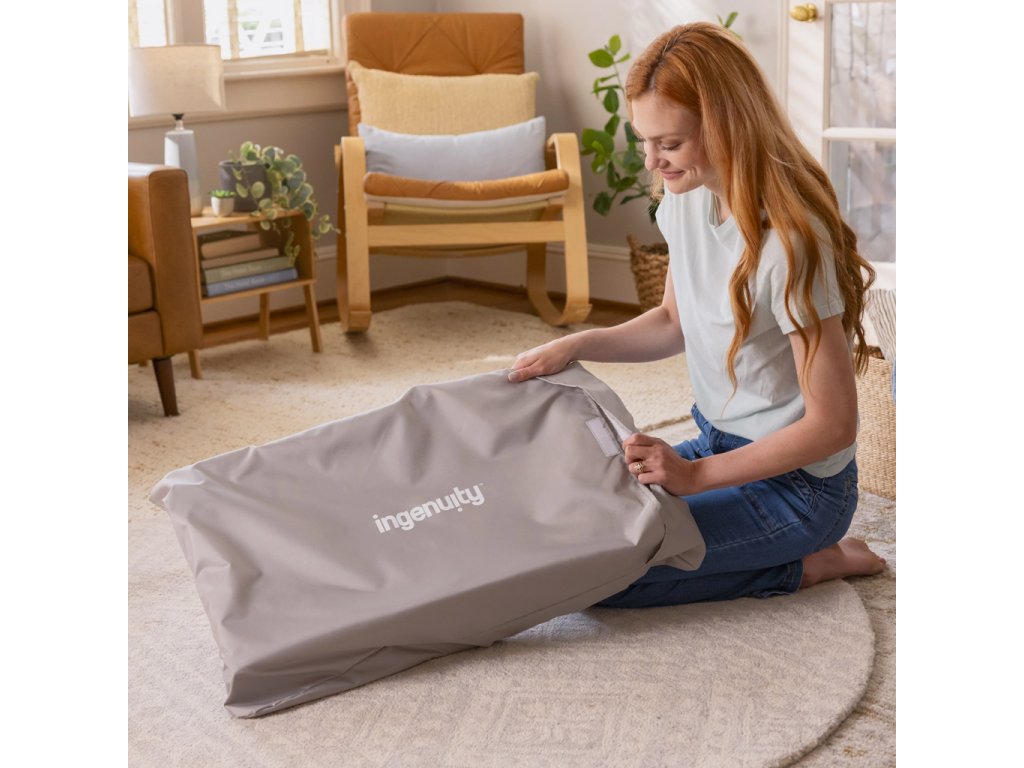 Moderní design s jemnými tkaninami a prošívaným středem skvěle zapadne do každého interiéru. Navíc lze snadno složit, uložit nebo přenést v přiložené cestové tašce.