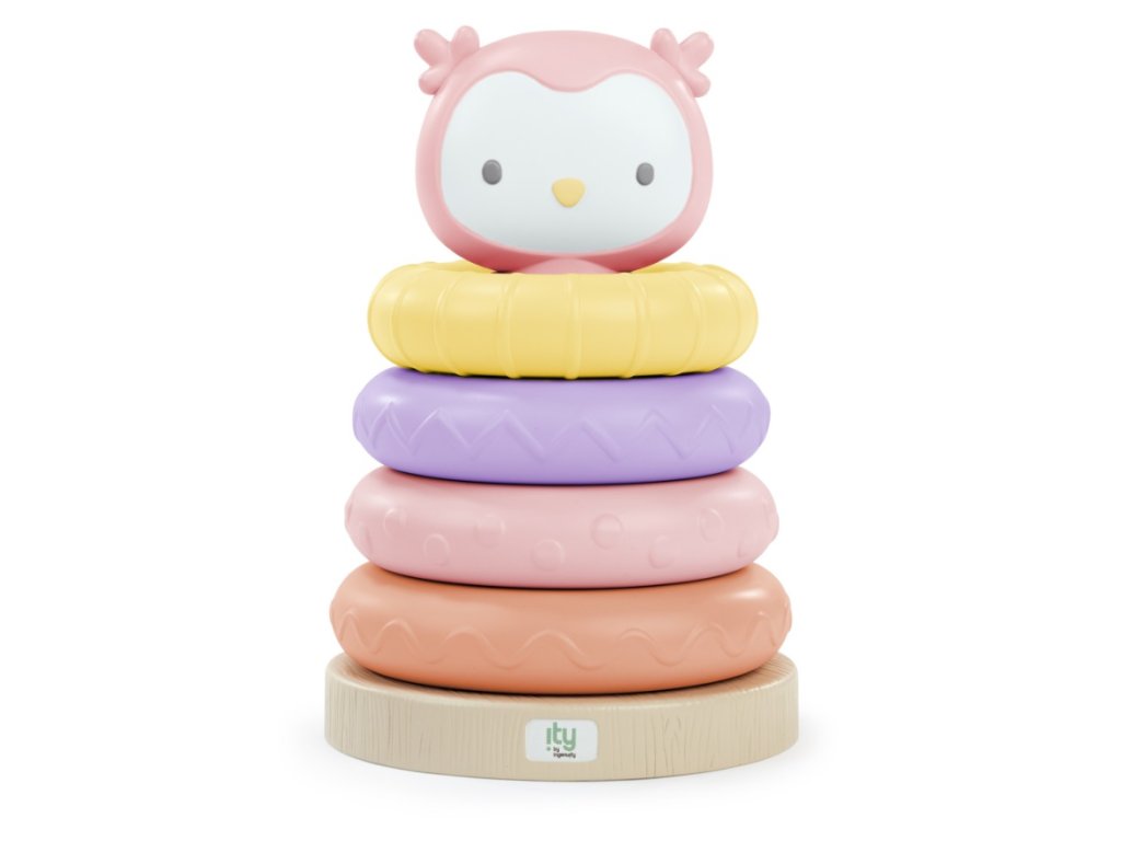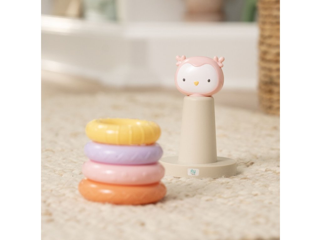 Pyramida a super roztomilá sovička Nally se dodávají se stojanem z umělého dřeva a 4 barevnými, lehkými prstenci s více texturami bez obsahu BPA, které se miminku snadno drží a stohují.