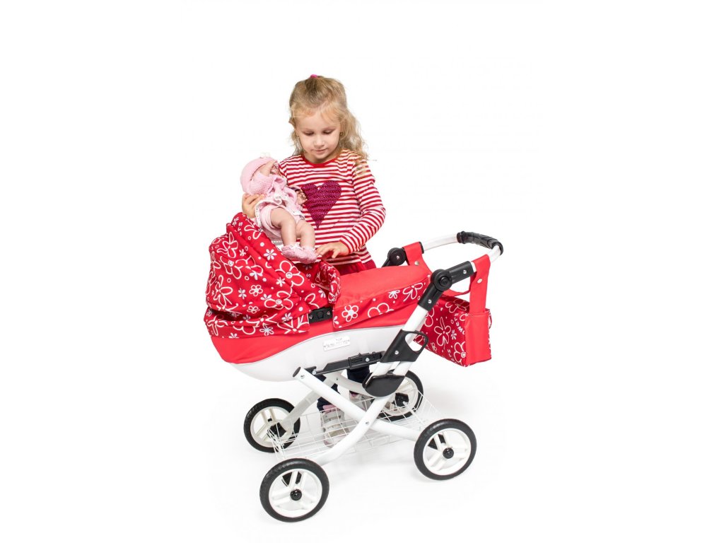 Praktický a moderní kočárek pro panenky Jasmine Kids 12 červený puntík s odolnou plastovou vaničkou.