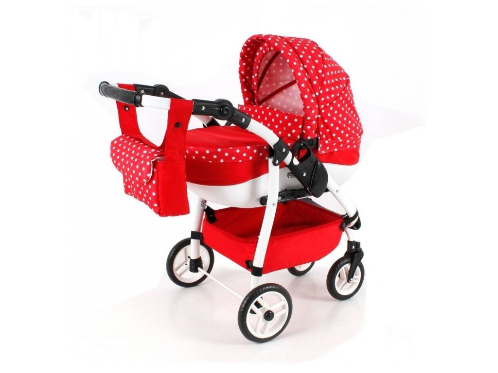 Červený kočárek pro panenky s otočnými koly pro pohodovou jízdu každé malé holčičky. Větší kočárek pro děti s velkou a pevnou vaničkou.