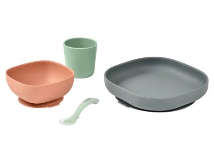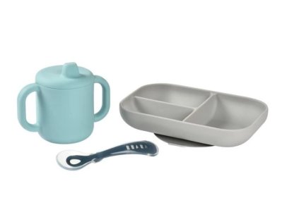 Sada talíře, misky, kelímku na pití a lžičky z vysoce kvalitního silikonu je ideální pro první samostatné krmení. Přísavka u misky a talíře umožňuje uchycení ke stolu...
